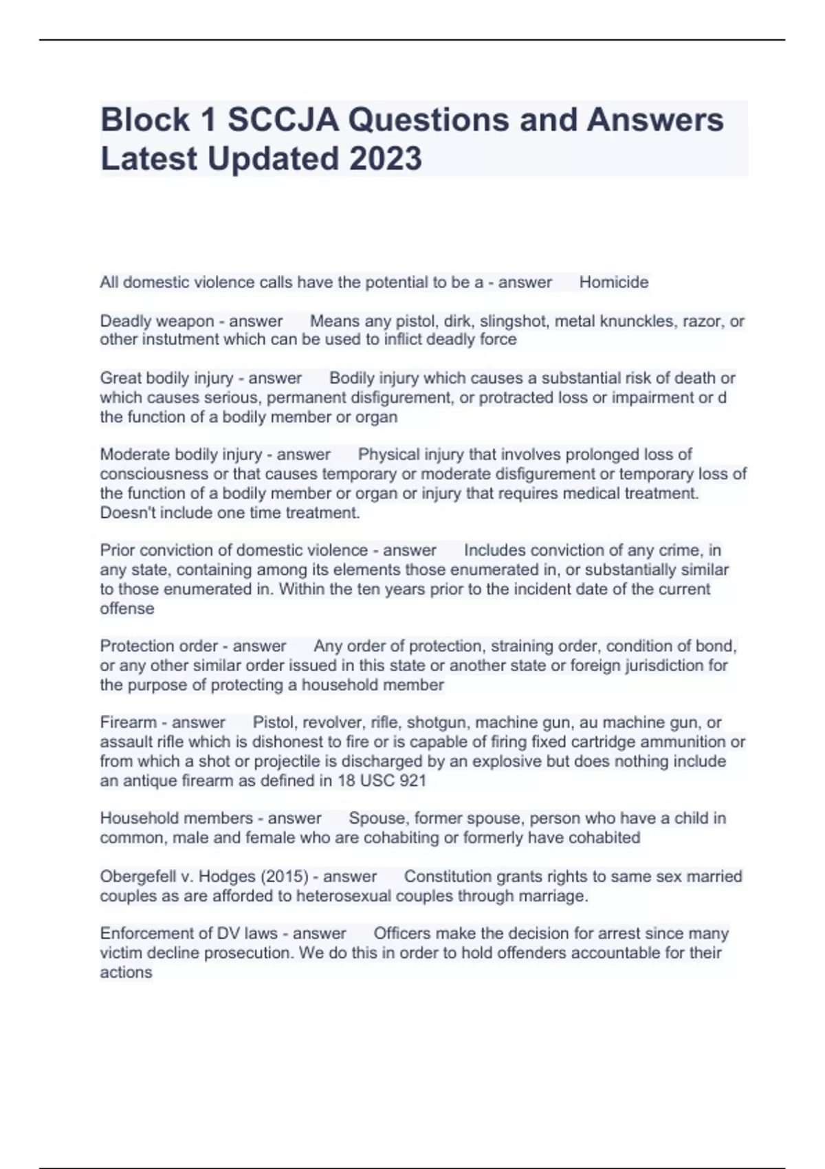 Block 1 SCCJA Questions and Answers Latest Updated 2023 All domestic violence calls have the potential to be a Homicide Deadly weapon Means any pistol, dirk, slingshot, metal knunckles, razor, or other instutment which can be used to inflict deadly force Great bodily injury Bodily injury which causes a substantial risk of death or which causes serious, permanent disfigurement, or protracted loss or impairment or d the function of a bodily member or organ Moderate bodily injury Physical injury that involves prolonged loss of consciousness or that causes temporary or moderate disfigurement or temporary loss of the function of a bodily member or organ or injury that requires medical treatment. Doesn't include one time treatment. Prior conviction of domestic violence Includes conviction of any crime, in any state, containing among its elements those enumerated in, or substantially similar to those enumerated in. Within the ten years prior to the incident date of the current offense Protection order Any order of protection, straining order, condition of bond, or any other similar order issued in this state or another state or foreign jurisdiction for the purpose of protecting a household member Firearm Pistol, revolver, rifle, shotgun, machine gun, au machine gun, or assault rifle which is dishonest to fire or is capable of firing fixed cartridge ammunition or from which a shot or projectile is discharged by an explosive but does nothing include an antique firearm as defined in 18 USC 921 Household members Spouse, former spouse, person who have a child in common, male and female who are cohabiting or formerly have cohabited Obergefell v. Hodges (2015) Constitution grants rights to same sex married couples as are afforded to heterosexual couples through marriage. Enforcement of DV laws Officers make the decision for arrest since many victim decline prosecution. We do this in order to hold offenders accountable for their actions Domestic violence (it is unlawful to) Cause physical harm or injury to a persons own household member; or offer or attempt to cause physical harm or injury to a persons own household member with apparent present ability under circumstances reasonably creating fear of imminent peril Person violates subsection (A) first part A person who violates this subsection is guilty about f a misdemeanor and, upon conviction, must be fined not less than one thousand dollars nor more then two thousand five hundred dollars or imprisoned not more than ninety days or both. Person violates subsection (A) second part Domestic violence in the third degree is a lesser-included offense of domestic violence in the second degree, as defined in subsection (C), domestic violence in the first degree, as defined in subsection (B), and domestic violence of a high and aggravated nature. Person violates subsection (A) third part Assault and battery in the third degree pursuant to section 16-3-600(E) is a lesser included offense of domestic violence in the third degree as defined in this subsection. A person who violates this subsection is eligible for pretrial intervention pursuant to chapter 22 title 17 I'm the process of committing DV in the 3rd degree one of the following also results a) the offense is committed in the presence of, or while being perceived by, a minor b) the offense is committed against a person known, or who reasonably should have been known, by the offender to be pregnant c) the offense is committed during the commission of a robbery, burglary, kidnapping, or theft d) the offense is committed by impeding the victims breathing or air flow The offense is committed using physical force or the threatened use of force against another to block that persons access to any cell phone, telephone or electronic communication device with the purpose of preventing, obstructing, or interfering with: The report of any criminal offense, bodily injury, or property damage to a law enforcement agency; or a request for an ambulance or emergency medical assistance to any law enforcement agency or emergency medical provider Felony offense-general sessions court a) great bodily injury to the persons own household member results or the act is accomplished by means likely to result in great bodily injury to the persons own household member b) the person violates a protection order and in the process of violating the order commits domestic violence in the second degree c) has two or more prior convictions of domestic violence within ten years of the current offense d) the person uses a firearm in any manner while violating the provisions of subsection (A) DV 1st degree Great bodily injury/likely result violation OOP/RO-commits DV 2nd 2 or more convictions DV/10 years, uses firearm DV 2nd Degree Moderate bodily injury/likely result, Violation of OOP/RO- commits 3rd, one prior conviction/10 years Person violates section 16-25-20 and one of the following from section 16-25-65 Commits the offense under circumstances manifesting extreme indifference to the value of human life & great bodily injury to the victim results; commits the offense, with or without an accompanying battery & under circumstances manifesting external indifference to the value of human life, & would reasonably cause a person to fear imminent great bodily injury or death; violates a protection order and, in the process to f violating the order, commits domestic violence in the first degree Circumstances manifesting extreme Indifference to the value of human life include, but are not limited to, the following; Using a deadly weapon, knowingly & intentionally impeding the normal breathing or circulation of the blood of a HH member by applying pressure to the throat or neck or by obstructing the nose or mouth of a HH member & thereby causing stupor or loss of consciousness for any period of time, commuting the offense in the presence of a minor, commuting the offense against a person he knew, or should have known, to be pregnant; commuting the