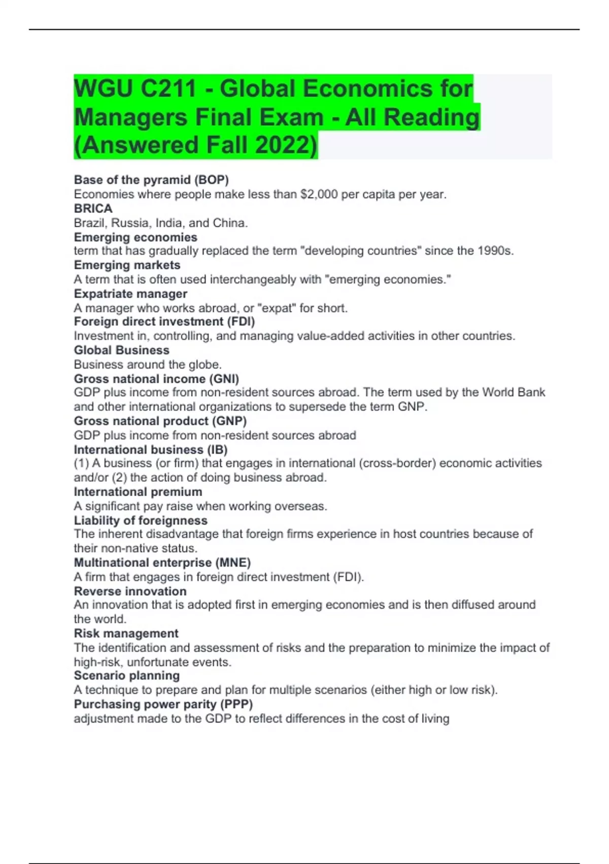WGU C211 - Global Economics for Managers Final Exam - All Reading (Answered Fall 2022) Base of the pyramid (BOP) Economies where people make less than $2,000 per capita per year. BRICA Brazil, Russia, India, and China. Emerging economies term that has gradually replaced the term "developing countries" since the 1990s. Emerging markets A term that is often used interchangeably with "emerging economies." Expatriate manager A manager who works abroad, or "expat" for short. Foreign direct investment (FDI) Investment in, controlling, and managing value-added activities in other countries. Global Business Business around the globe. Gross national income (GNI) GDP plus income from non-resident sources abroad. The term used by the World Bank and other international organizations to supersede the term GNP. Gross national product (GNP) GDP plus income from non-resident sources abroad International business (IB) (1) A business (or firm) that engages in international (cross-border) economic activities and/or (2) the action of doing business abroad. International premium A significant pay raise when working overseas. Liability of foreignness The inherent disadvantage that foreign firms experience in host countries because of their non-native status. Multinational enterprise (MNE) A firm that engages in foreign direct investment (FDI). Reverse innovation An innovation that is adopted first in emerging economies and is then diffused around the world. Risk management The identification