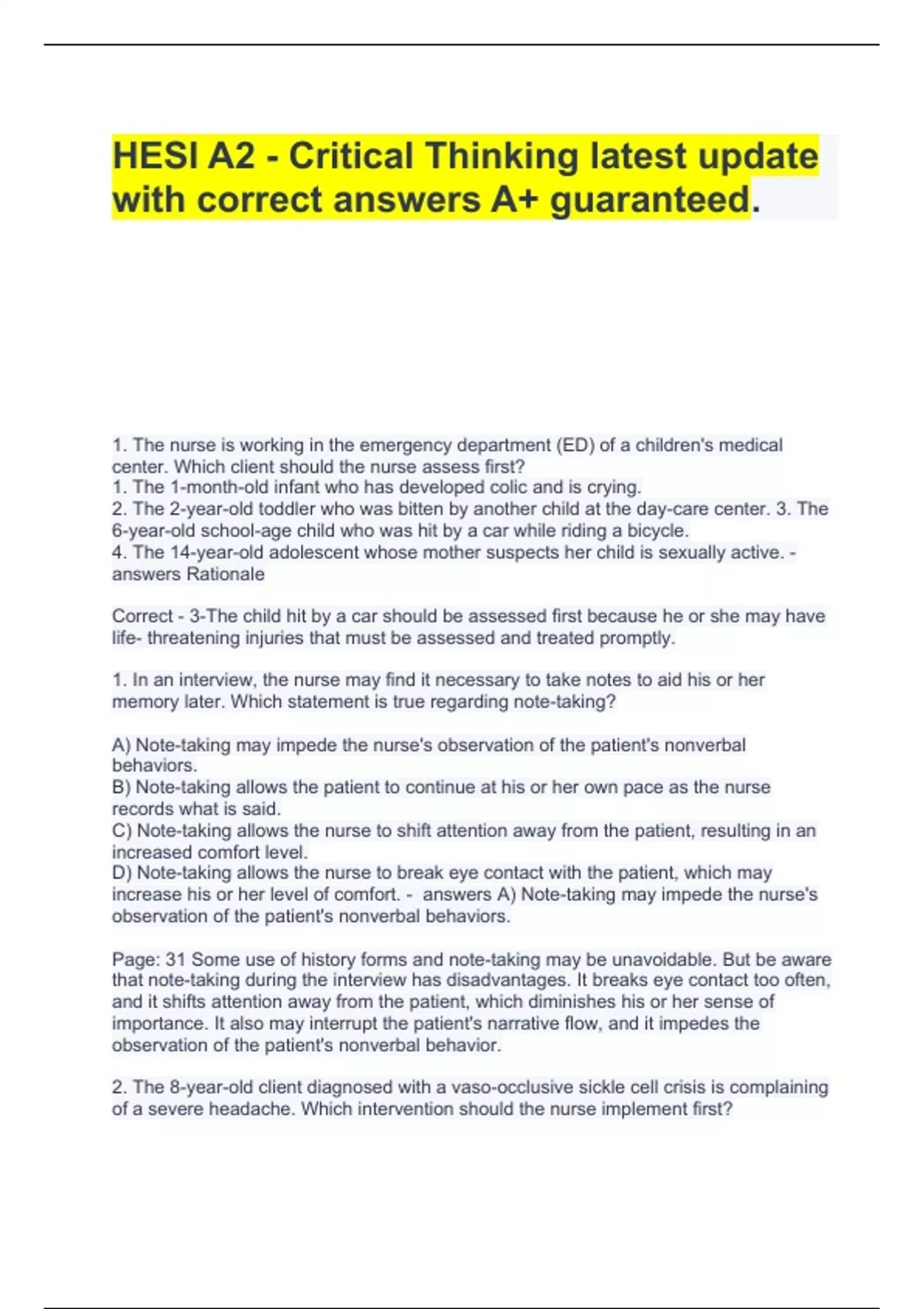 HESI A2 - Critical Thinking latest update with correct answers A+ guaranteed. 1. The nurse is working in the emergency department (ED) of a children's medical center. Which client should the nurse assess first? 1. The 1-month-old infant who has developed colic and is crying. 2. The 2-year-old toddler who was bitten by another child at the day-care center. 3. The 6-year-old school-age child who was hit by a car while riding a bicycle. 4. The 14-year-old adolescent whose mother suspects her child is sexually active. - answers Rationale . 1. In an interview, the nurse may find it necessary to take notes to aid his or her memory later. Which statement is true regarding note-taking? A) Note-taking may impede the nurse's observation of the patient's nonverbal behaviors. B) Note-taking allows the patient to continue at his or her own pace as the nurse records what is said. C) Note-taking allows the nurse to shift attention away from the patient, resulting in an increased comfort level. D) Note-taking allows the nurse to break eye contact with the patient, which may increase his or her level of comfort. 2. The 8-year-old client diagnosed with a vaso-occlusive sickle cell crisis is complaining of a severe headache. Which intervention should the nurse implement first? 1. Administer 6 L of oxygen via nasal cannula. 2. Assess the client's neurological status. 3. Administer a narcotic analgesic by intravenous push (IVP). 4. Increase the client's intravenous (IV) rate. - answers Rationale 2. During an interview, the nurse states, "You mentioned shortness of breath. Tell me more about that." Which verbal skill is used with this statement? A) Reflection B) Facilitation C) Direct question D) Open-ended question - 3. The 6-year-old client who has undergone abdominal surgery is attempting to make a pinwheel spin by blowing on it with the nurse's assistance. The child starts crying because the pinwheel won't spin. Which action should the nurse implement first? 1. Praise the child for the attempt to make the pinwheel spin. 2. Notify the respiratory therapist to implement incentive spirometry. 3. Encourage the child to turn from side to side and cough. 4. Demonstrate how to make the pinwheel spin by blowing on it. - answers Rationale 3. A nurse is taking complete health histories on all of the patients attending a wellness workshop. On the history form, one of the written questions asks, "You don't smoke, drink, or take drugs, do you?" This question is an example of: A) talking too much. B) using confrontation. C) using biased or leading questions. D) using blunt language to deal with distasteful topics. - 4. The nurse is caring for clients on the pediatric medical unit. Which client should the nurse assess first? 1. The child diagnosed with type 1 diabetes who has a blood glucose level of 180 mg/dL. 2. The child diagnosed with pneumonia who is coughing and has a temperature of 100°F. 3. The child diagnosed with gastroenteritis who has a potassium (K+) level of 3.9 mEq/L. 4. The child diagnosed with cystic fibrosis who has a pulse oximeter reading of 90%. - answers Rationale . 4. During an interview, a parent of a hospitalized child is sitting in an open position. As the interviewer begins to discuss his son's treatment, however, he suddenly crosses his arms against his chest and crosses his legs. This would suggest that the parent is: A) just changing positions. B) more comfortable in this position. C) tired and needs a break from the interview. D) uncomfortable talking about his son's treatment. - 5. The nurse has received the a.m. shift report for clients on a pediatric unit. Which medication should the nurse administer first? 1. The third dose of the aminoglycoside antibiotic to the child diagnosed with methicillin-resistant Staphylococcus aureus (MRSA). 2. The IVP steroid methylprednisolone (Solu-Medrol) to the child diagnosed with asthma. 3. The sliding scale insulin to the child diagnosed with type 1 diabetes mellitus. 4. The stimulant methylphenidate (Ritalin) to a child diagnosed with attention deficit-hyperactivity disorder (ADHD). - 5. The nurse is interviewing a patient who has a hearing impairment. What techniques would be most beneficial in communicating with this patient? A) Determine the communication method he prefers. B) Avoid using facial and hand gestures because most hearing-impaired people find this degrading. C) Request a sign language interpreter before meeting with him to help facilitate the communication. D) Speak loudly and with exaggerated facial movement when talking with him because this helps with lip reading. - 6. The nurse enters the client's room and realizes the 9-month-old infant is not breath- ing. Which interventions should the nurse implement? Prioritize the nurse's actions from first (1) to last (5). ................................................continued..................................................