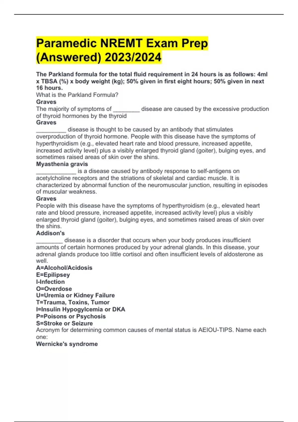 Paramedic NREMT Exam Prep (Answered) 2023/2024 The Parkland formula for the total fluid requirement in 24 hours is as follows: 4ml x TBSA (%) x body weight (kg); 50% given in first eight hours; 50% given in next 16 hours. What is the Parkland Formula? Graves The majority of symptoms of ________ disease are caused by the excessive production of thyroid hormones by the thyroid Graves _________ disease is thought to be caused by an antibody that stimulates overproduction of thyroid hormone. People with this disease have the symptoms of hyperthyroidism (e.g., elevated heart rate and blood pressure, increased appetite, increased activity level) plus a visibly enlarged thyroid gland (goiter), bulging eyes, and sometimes raised areas of skin over the shins. Myasthenia gravis ____________ is a disease caused by antibody response to self-antigens on acetylcholine receptors and the striations of skeletal and cardiac muscle. It is characterized by abnormal function of the neuromuscular junction, resulting in episodes of muscular weakness. Graves People with this disease have the symptoms of hyperthyroidism (e.g., elevated heart rate and blood pressure, increased appetite, increased activity level) plus a visibly enlarged thyroid gland (goiter), bulging eyes, and sometimes raised areas of skin over the shins. Addison's ________ disease is a disorder that occurs when your body produces insufficient amounts of certain hormones produced by your adrenal glands. In this disease, your adrenal glands produce too little cortisol and often insufficient levels of aldosterone as well. A=Alcohol/Acidosis E=Epilipsey I-Infection O=Overdose U=Uremia or Kidney Failure T=Trauma, Toxins, Tumor I=Insulin Hypogylcemia or DKA P=Poisons or Psychosis S=Stroke or Seizure Acronym for determining common causes of mental status is AEIOU-TIPS. Name each one: Wernicke's syndrome ___________ is an acute but reversible encephalopathy or brain disease characterized by ataxia, eye muscle weakness, and mental derangement. Korsakoff's psychosis psychosis characterized by disorientation, muttering delirium, insomnia, delusions, and hallucinations. Symptoms include painful extremities, bilateral wrist drop (rarely), bilateral foot drop (frequently), and pain on pressure over the long nerves. Wernicke's syndrome condition characterized by loss of memory and disorientation, associated with chronic alcohol intake and a diet deficient in thiamine. Mallampati Scale Waddell's triad ___________ is a pattern of injury seen in pedestrian children who are struck by motor vehicles. The triad comprises: fractured femoral shaft. intra-thoracic or intra-abdominal injuries. contralateral head injury. Addison's disease Symptoms may include weakness, fatigue, weight loss, and hyperpigmentation of skin and mucous membranes. Waddell's triad Mallory-Weiss tear esophageal laceration, usually secondary to vomiting. Zollinger-Ellison syndrome condition that causes the stomach to secrete excessive amounts of hydrochloric acid and pepsin. visceral pain dull, poorly localized pain that originates in the walls of hollow organs such as the ureter or bladder. afferent Sensory nerves are _______ nerves. somatic pain sharp, localized pain that originates in walls of the body such as skeletal muscles. BP goes up, Pulse falls and respiration fall Signs of Cushings triad is opposite of the signs of shock. Describe what happens to BP, Pulse and Respirations in cushings triad BP drops, Pulse rises and respirations rise Describe what happens to BP, Pulse and Respirations in shock: Addison's Disease Also called adrenal insufficiency aberrant conduction conduction of the electrical impulse through the heart's conductive system in an abnormal fashion. absence seizure type of generalized seizure with sudden onset, characterized by a brief loss of awareness and rapid recovery. absence An _________ seizure causes a short period of "blanking out" or staring into space. Like other kinds of seizures, they are caused by abnormal activity in a person's brain. You may also hear people call these seizures petit mal ("PUH-tee mahl") seizures, although that name is not common anymore. acquired immunity immunity that develops over time and results from exposure to an antigen. active immunity _________ is an acquired immunity that occurs following exposure to an antigen and results in the production of antibodies specific for the antigen; protection against disease developed after birth as a result of a direct exposure to the disease. acute coronary syndrome (ACS) What is a spectrum of coronary artery disease processes from myocardial ischemia and myocardial injury to myocardial infarction that includes the clinical entities of stable and unstable angina and acute myocardial infarction. acute respiratory distress syndrome (ARDS) What is a form of pulmonary edema that is caused by fluid accumulation in the interstitial space within the lungs. acute tubular necrosis a particular syndrome characterized by the sudden death of tubular cells. Addison's disease What is an endocrine disorder characterized by adrenocortical insufficiency. Symptoms may include weakness, fatigue, weight loss, and hyperpigmentation of skin and mucous membranes. Addisonian crisis form of shock associated with adrenocortical insufficiency and characterized by profound hypotension and electrolyte imbalances. amyotrophic lateral sclerosis (ALS) Also called Lou Gehrig's disease. afferent carrying impulses toward the central nervous system. afterload the resistance against which the heart must pump. Alzheimer's disease a degenerative brain disorder; the most common cause of dementia in the elderly. amyotrophic lateral sclerosis (ALS) progressive degeneration of specific nerve cells that control voluntary movement characterized by weakness, loss of motor control, difficulty speaking, and cramping. anastomosis communication between two or more vessels. anemia an inadequate number of red blood cells or inadequate hemoglobin 