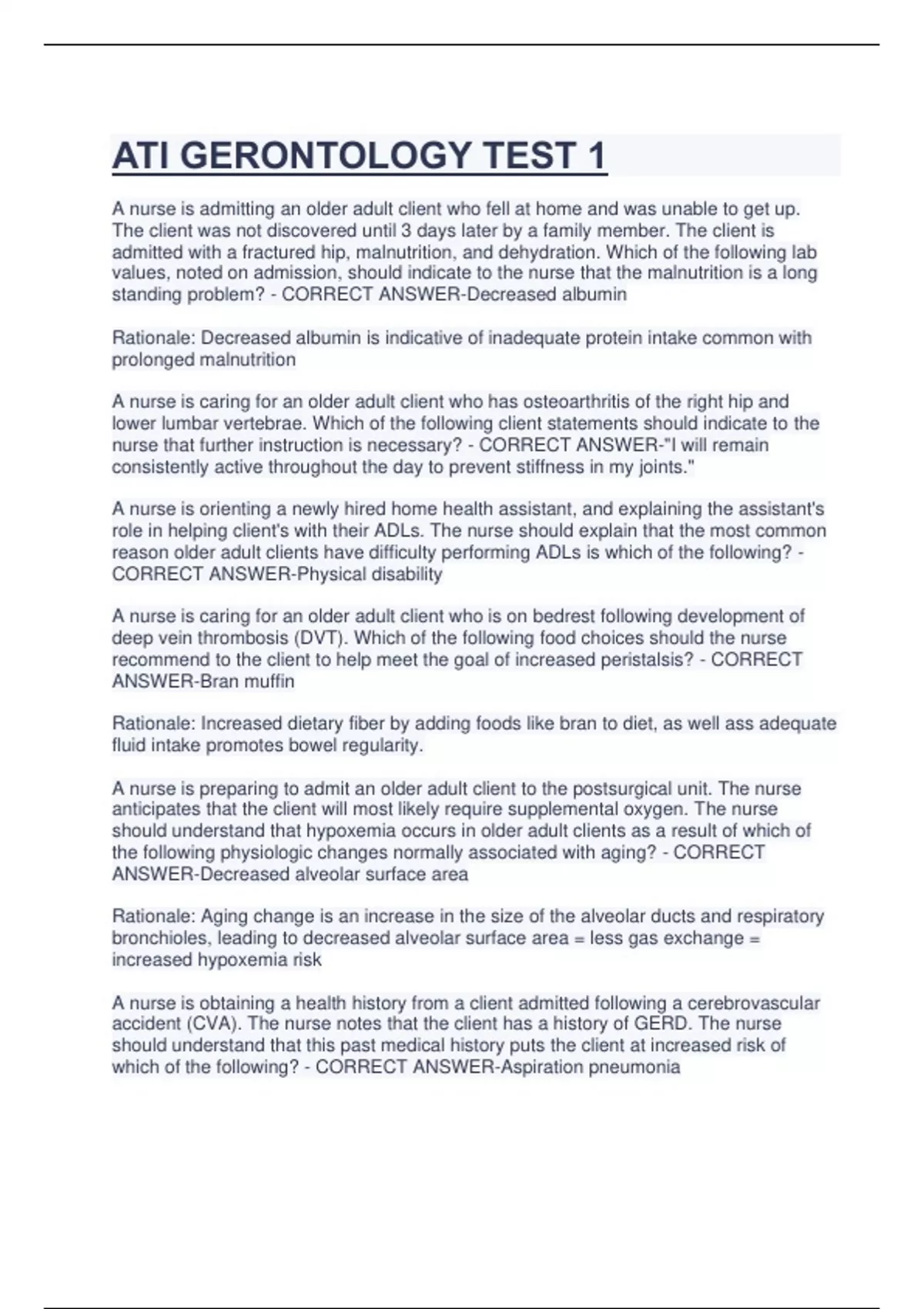 ATI GERONTOLOGY TEST 1 A nurse is admitting an older adult client who fell at home and was unable to get up. The client was not discovered until 3 days later by a family member. The client is admitted with a fractured hip, malnutrition, and dehydration. Which of the following lab values, noted on admission, should indicate to the nurse that the malnutrition is a long standing problem? - CORRECT ANSWER-Decreased albumin Rationale: Decreased albumin is indicative of inadequate protein intake common with prolonged malnutrition A nurse is caring for an older adult client who has osteoarthritis of the right hip and lower lumbar vertebrae. Which of the following client statements should indicate to the nurse that further instruction is necessary? - CORRECT ANSWER-"I will remain consistently active throughout the day to prevent stiffness in my joints." A nurse is orienting a newly hired home health assistant, and explaining the assistant's role in helping client's with their ADLs. The nurse should explain that the most common reason older adult clients have difficulty performing ADLs is which of the following? - CORRECT ANSWER-Physical disability A nurse is caring for an older adult client who is on bedrest following development of deep vein thrombosis (DVT). Which of the following food choices should the nurse recommend to the client to help meet the goal of increased peristalsis? - CORRECT ANSWER-Bran muffin Rationale: Increased dietary fiber by adding foods like bran to diet, as well ass adequate fluid intake promotes bowel regularity. A nurse is preparing to admit an older adult client to the postsurgical unit. The nurse anticipates that the client will most likely require supplemental oxygen. The nurse should understand that hypoxemia occurs in older adult clients as a result of which of the following physiologic changes normally associated with aging? - CORRECT ANSWER-Decreased alveolar surface area Rationale: Aging change is an increase in the size of the alveolar ducts and respiratory bronchioles, leading to decreased alveolar surface area = less gas exchange = increased hypoxemia risk A nurse is obtaining a health history from a client admitted following a cerebrovascular accident (CVA). The nurse notes that the client has a history of GERD. The nurse should understand that this past medical history puts the client at increased risk of which of the following? - CORRECT ANSWER-Aspiration pneumonia A nurse in a post-surgical unit is admitting an older adult client from the recovery department following abdominal surgery for a bowel obstruction. Of which of the following information regarding pain management should the nurse be aware? Older adult clients - CORRECT ANSWER-are sensitive to the analgesic effect of opiates. A nurse is writing a plan of care for a client who had a cerebrovascular accident (CVA). Which of the following should the nurse identify as a priority goal for a client following a CVA? - CORRECT ANSWER-Airway will remain clear as evidenced by clear breath sounds. Rationale: CVA = high risk for airway obstruction and aspiration r/t loss of muscle control. Client should be in side-lying position A nurse is administering an antihistamine to an older adult client. Which of the following is an appropriate nursing statement? - CORRECT ANSWER-"Antihistamines should be used cautiously in clients who have glaucoma." Rationale: Most antihistamines have an anticholinergic effect. Glaucoma incidence is increased in older adult clients. A nurse is part of a committee that is developing age-appropriate care standards. Which of the following should the nurse know is the focus for older adult clients, based on Erikson's developmental tasks? - CORRECT ANSWER-Integrity Rationale: Integrity vs despair is the stage for older adults in which they reflect on their lives and roles. A nurse is caring for a client who has Alzheimer's disease. The client has been oriented to name and place and is able to perform ADLs with minimal supervision. When the client refuses to take morning anti hypertensive medications, the nurse's first action should be to do which of the following? - CORRECT ANSWER-Ask the client to express her reasons for refusing the morning medications and document the event. Rationale: Before intervening or making a judgement about client's competence, the nurse should complete an assessment of the client. Perhaps the clients reason for refusal is as simple as having a sore throat of being afraid to swallow. A nurse working in a medical unit is caring for a male client who has dementia. The nurse notes that the client becomes agitated and confused in his room at night. The client, who has an unsteady gait, removes all of his clothes and wanders about naked in his room and the hallway. Which of the following actions should the nurse take first? - CORRECT ANSWER-Move the client to a room closer to the nurse's station. A nurse is assessing an older adult client who states, "I haven't seen a doctor in years. I walk 5 miles a day and I'm as healthy as a horse." Which of the following findings, obtained while taking the client's history and performing a physical examination, should the nurse explain to the client requires further evaluation? - CORRECT ANSWER-The client's fingerstick blood glucose is 160 mg/dL. Rational: 160mg/dl is elevated and may be early signs of DM A nurse at an assisted living center is conducting an orientation session for newly hired assistive personnel (AP). Because several of the older adult residents are hearing impaired, the nurse includes instruction for promoting communication. Which of the following instructions should the nurse include? - CORRECT ANSWER-Maintain eye contact with the clients and speak slowly. Rationale: Many older adults with hearing impairment use lip-reading and gestures to help understand. A nurse is caring for an overweight, older adult resident who has gout. The client has been refusing to eat stating, "I can't stand the food." The cli