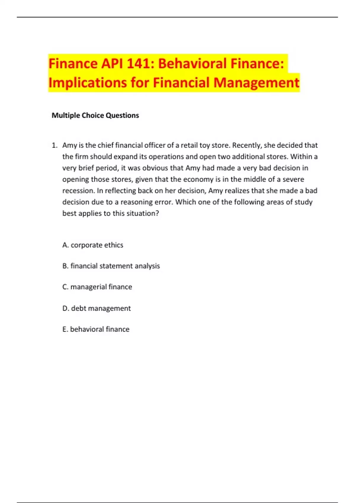 Finance API 141: Behavioral Finance: Implications for Financial Management