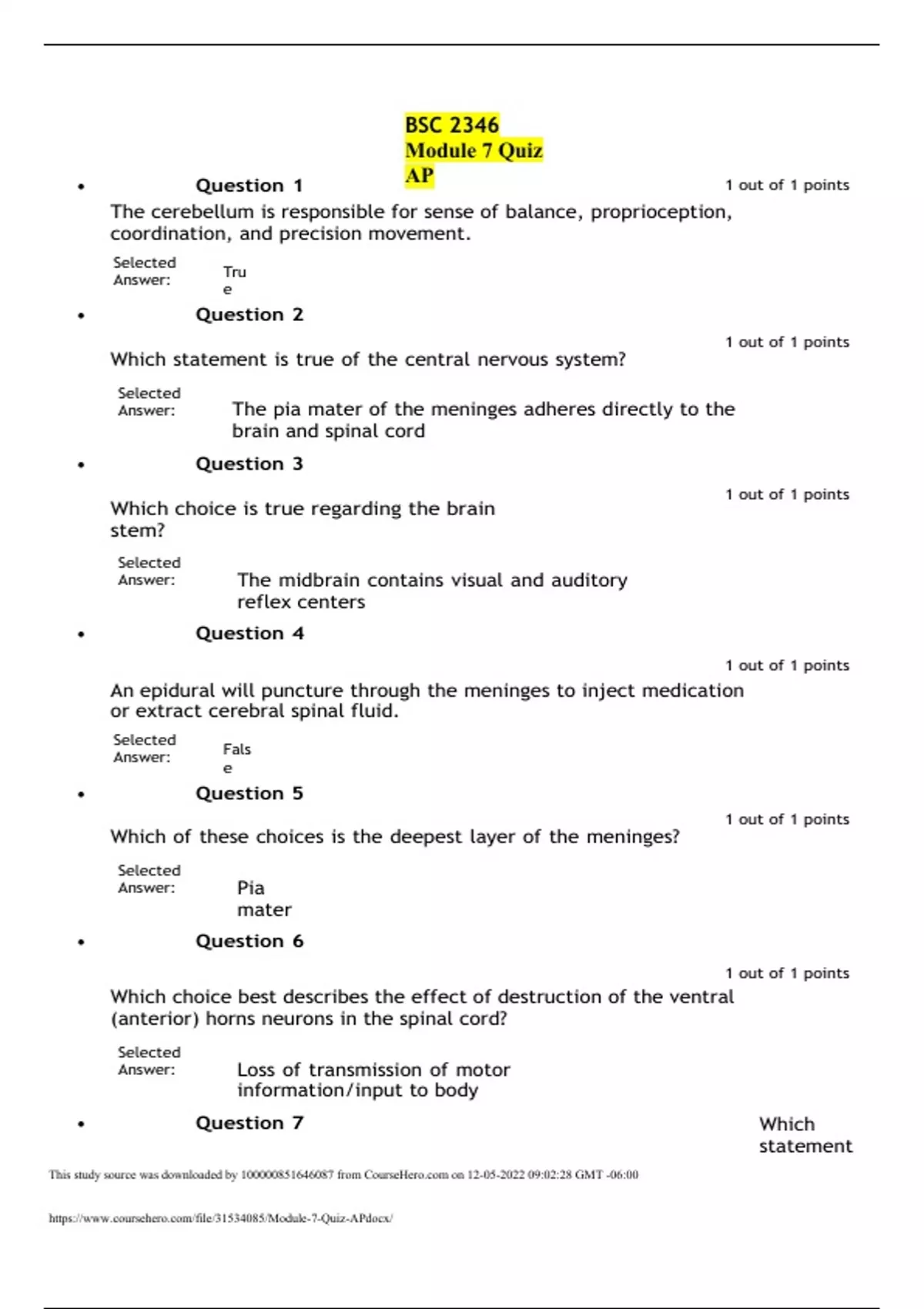 •Question 1 BSC 2346 Module 7 Quiz AP 1 out of 1 points The cerebellum is responsible for sense of balance, proprioception, coordination, and precision movement. Selected Answer: Tru e •Question 2 Which statement is true of the central nervous system? 1 out of 1 points Selected Answer: The pia mater of the meninges adheres directly to the brain and spinal cord •Question 3 Which choice is true regarding the brain stem? 1 out of 1 points Selected Answer: The midbrain contains visual and auditory reflex centers •Question 4 1 out of 1 points An epidural will puncture through the meninges to inject medication or extract cerebral spinal fluid. Selected Answer: Fals e •Question 5 Which of these choices is the deepest layer of the meninges? 1 out of 1 points Selected Answer: Pia mater •Question 6 1 out of 1 points Which choice best describes the effect of destruction of the ventral (anterior) horns neurons in the spinal cord? Selected Answer: Loss of transmission of motor information/input to body •Question 7 Which statement is true regarding the cerebrospinal fluid (CSF)? 1 out of 1 points Selected Answer: CSF is produced by choroid plexus in the