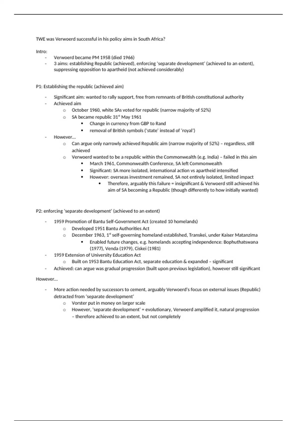 - More action needed by successors to cement, arguably Verwoerd’s focus on external issues (Republic)