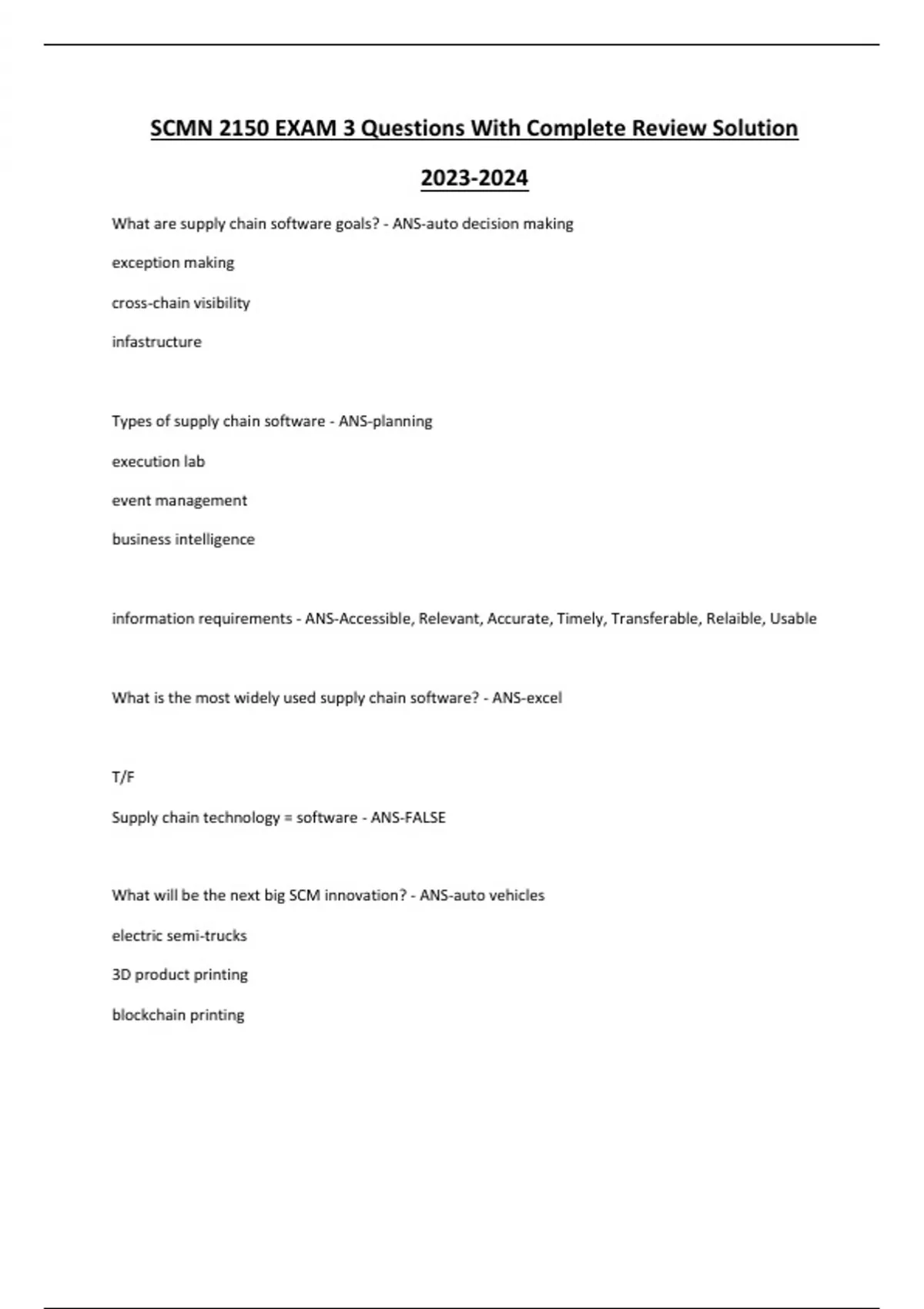 SCMN 2150 EXAM 3 Questions With Complete Review Solution What are supply chain software goals? - ANS-auto decision making exception making cross-chain visibility infastructure Types of supply chain software - ANS-planning execution lab event management business intelligence information requirements - ANS-Accessible, Relevant, Accurate, Timely, Transferable, Relaible, Usable What is the most widely used supply chain software? - ANS-excel T/F Supply chain technology = software - ANS-FALSE What will be the next big SCM innovation? - ANS-auto vehicles electric semi-trucks 3D product printing blockchain printing Cloud Computing Examples - ANS-on-demand access, pay-as-you-go, 3rd party expertise, veracity (one version of truth) Three technologies that may change the way we capture and utilize supply chain data - ANS-- cloud computing - mobile technology - anlaytics Mobile Technology - ANS-enchance visibility, real-time, becoming inexpensive, apps Analytics - ANS-big data, volume, velocity, variety, veracity Supply Chain Solutions - ANS-support the forward-looking process of coordinating assets to optimize the delivery of goods, services and information from supplier to customer, balancing supply and demand. Supply-Chain Planning Software - ANS-sits on top of a transactional system to provide planning, what-if scenario analysis capabilities and real-time demand commitments, considering constraints. Which SCP support a company's efforts to design their supply chains, taking account of future alternative operating models and/or trade-offs between different configuration? - ANS-Configuration Which SCP creation and evaluation of optimal plans within the context of the company's current operating model. - ANS-Optimize Which SCP supports the ability to profitably respond to changes in any aspect of execution in a nearreal-time manner. - ANS-Respond What are the supply chain execution methods? - ANS-Manufacturing Execution Systems Order Management Systems Warehouse Management Systems Transportation Management Systems By building in ----, the system can offer suggestions that allow a decision-maker to implement the best alternative in terms of cost, time and customer service requirements - ANS-Workflow Rules The three levels BI and analytics cuts across - ANS-strategic decision making at the top of the organization, tactical in the middle and operational at the base BI and analytics cut across the tactical and --- level - ANS-operational Enterprise Resource Planning - ANS-software that allows an organization to use a system of integrated applications to manage the business and automate many back office functions related to technology, services and human resources. Supplier Relationship Management - ANS-- focuses on keeping suppliers satisfied by evaluating and categorizing suppliers for different projects - software enables businesses to manage the relationship between buyers and suppliers. Customer Relationship Management - ANS-- CONTINUES...