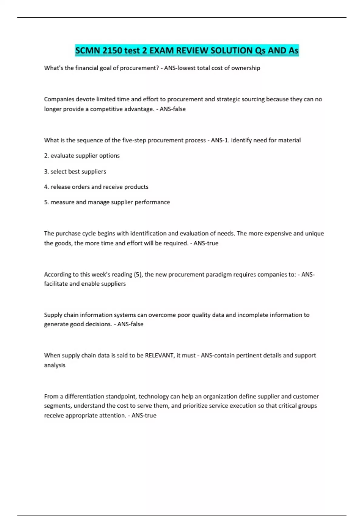 SCMN 2150 test 2 EXAM REVIEW SOLUTION Qs AND As What's the financial goal of procurement? - ANS-lowest total cost of ownership Companies devote limited time and effort to procurement and strategic sourcing because they can no longer provide a competitive advantage. - ANS-false What is the sequence of the five-step procurement process - ANS-1. identify need for material 2. evaluate supplier options 3. select best suppliers 4. release orders and receive products 5. measure and manage supplier performance The purchase cycle begins with identification and evaluation of needs. The more expensive and unique the goods, the more time and effort will be required. - ANS-true According to this week's reading (5), the new procurement paradigm requires companies to: - ANSfacilitate and enable suppliers Supply chain information systems can overcome poor quality data and incomplete information to generate good decisions. - ANS-false When supply chain data is said to be RELEVANT, it must - ANS-contain pertinent details and support analysis From a differentiation standpoint, technology can help an organization define supplier and customer segments, understand the cost to serve them, and prioritize service execution so that critical groups receive appropriate attention. - ANS- Continues...
