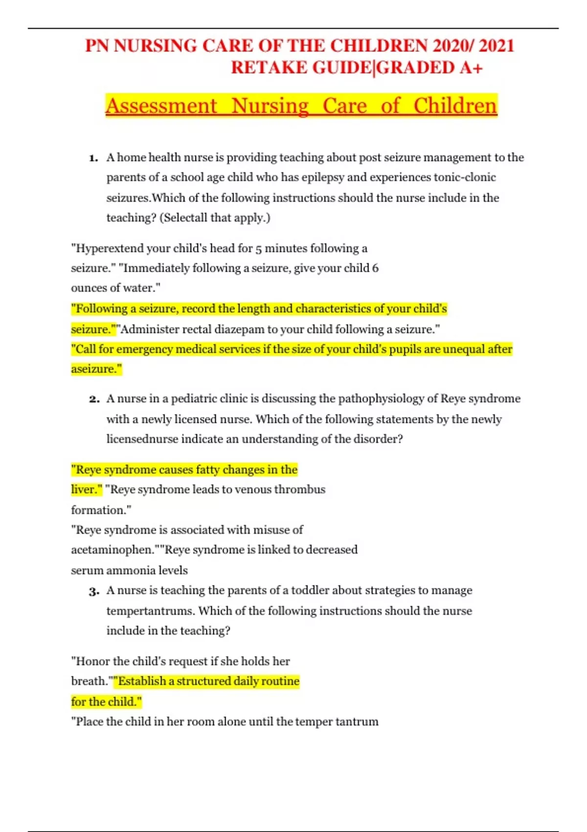 PN NURSING CARE OF THE CHILDREN 2020/ 2021 RETAKE GUIDE|GRADED A+