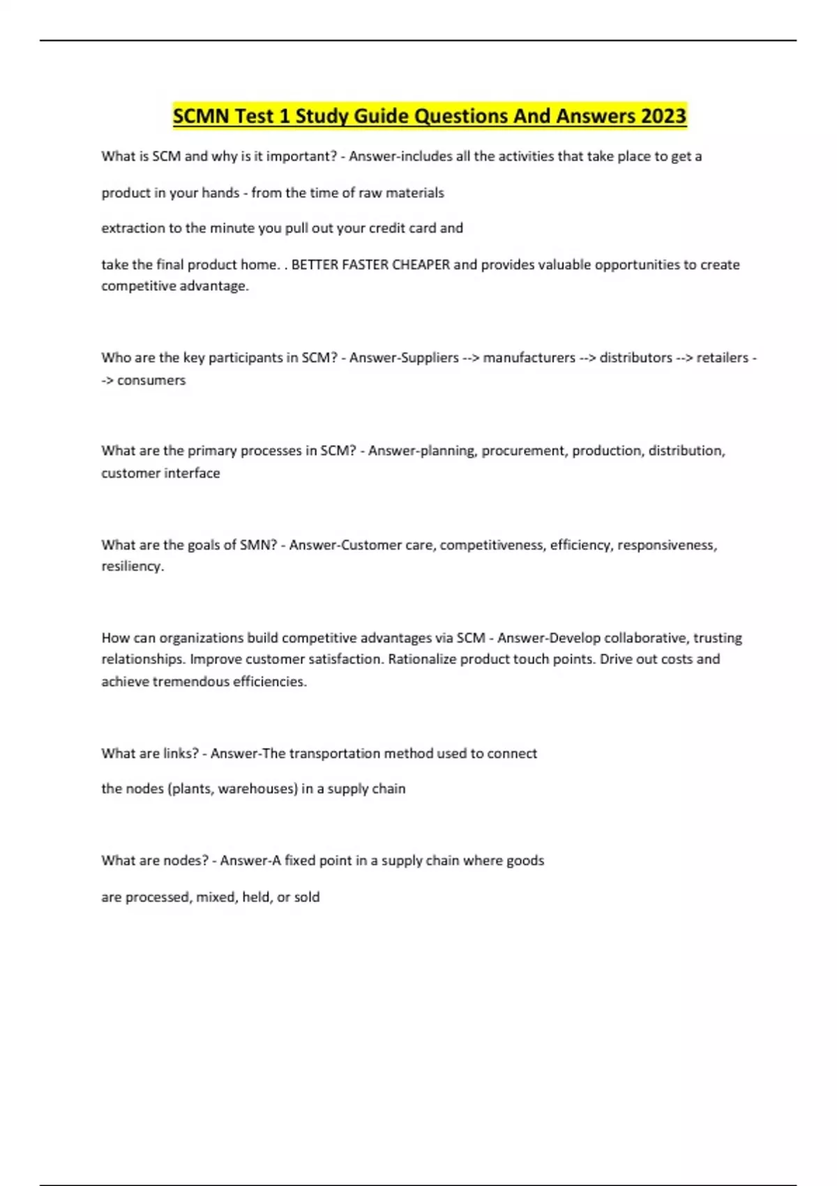 SCMN Test 1 Study Guide Questions And Answers 2023 What is SCM and why is it important? - Answer-includes all the activities that take place to get a product in your hands - from the time of raw materials extraction to the minute you pull out your credit card and take the final product home. . BETTER FASTER CHEAPER and provides valuable opportunities to create competitive advantage. Who are the key participants in SCM? - Answer-Suppliers --> manufacturers --> distributors --> retailers - -> consumers What are the primary processes in SCM? - Answer-planning, procurement, production, distribution, customer interface What are the goals of SMN? - Answer-Customer care, competitiveness, efficiency, responsiveness, resiliency. How can organizations build competitive advantages via SCM - Answer-Develop collaborative, trusting relationships. Improve customer satisfaction. Rationalize product touch points. Drive out costs and achieve tremendous efficiencies. What are links? - Answer-The transportation method used to connect the nodes (plants, warehouses) in a supply chain What are nodes? - Answer-A fixed point in a supply chain where goods are processed, mixed, held, or sold What value-adding process takes place at supply chain nodes? - Answer-Incoming materials are converted into a more valuable state (quantity, assortment, form) to meet downstream customer needs. Centralized network - Answer-the single node controls customer interaction, the flow of goods, and other key activities on a national basis ex: L.L. Bean - National Distribution - Lower inventory investment - Lower safety stock levels - Lower inbound transportation cost -Higher outbound transportation cost - effective service levels Decentralized network - Answer-each node controls customer interaction, the flow of goods, and other key activities within its region ex: Kroger -Regional Distribution -Greater Inventory Investment -Higher level safety stock -Higher Inbound Transportation cost -Lower Outbound Transportation cost -Highly effective service levels direct distribution - Answer-s