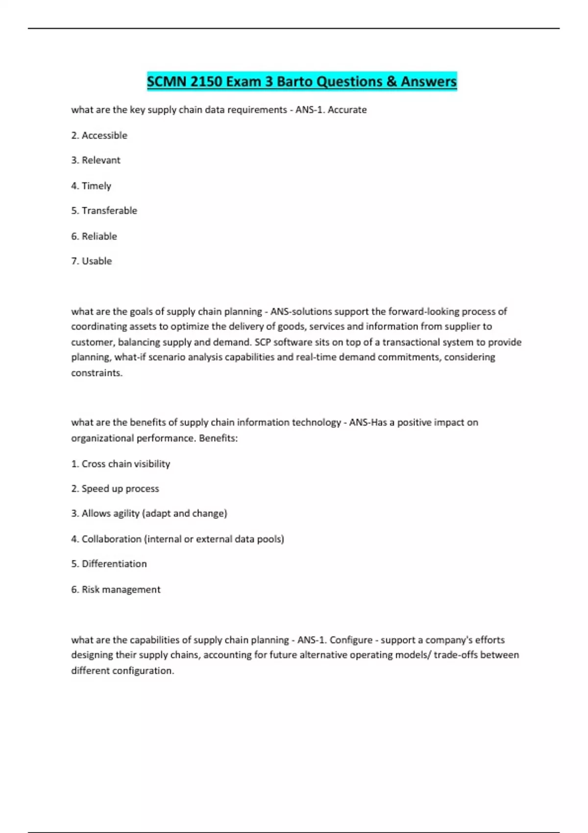 SCMN 2150 Exam 3 Barto Questions & Answers what are the key supply chain data requirements - ANS-1. Accurate 2. Accessible 3. Relevant 4. Timely 5. Transferable 6. Reliable 7. Usable what are the goals of supply chain planning - ANS-solutions support the forward-looking process of coordinating assets to optimize the delivery of goods, services and information from supplier to customer, balancing supply and demand. SCP software sits on top of a transactional system to provide planning, what-if scenario analysis capabilities and real-time demand commitments, considering constraints. what are the benefits of supply chain information technology - ANS-Has a positive impact on organizational performance. Benefits: 1. Cross chain visibility 2. Speed up process 3. Allows agility (adapt and change) 4. Collaboration (internal or external data pools) 5. Differentiation 6. Risk management what are the capabilities of supply chain planning - ANS-1. Configure - support a company's efforts designing their supply chains, accounting for future alternative operating models/ trade-offs between different configuration. 2. Optimize - creation and evaluation of optimal plans within the context of the company's current operating model. 3. Respond - support ability to profitably respond to changes in any aspect of execution in a near-realtime manner. what are the major categories of supply chain software - ANS-1. Supply Chain Planning 2. Supply Chain Execution 3. Event Management & Visibility 4. Business Intelligence 5. Facilitating tools what is business intelligence - ANS-Extract key data across the supply chain and provide to decision makers standard and ad hoc reporting, dashboards, alerts, queries. structured data, traditional sources, manageable data sets. What happened last quarter, how many did we sell, wheres the problem what is predictive analytics - ANS-optimization, predictive modeling, forecasting, statistical analysis. structured/unstructured data, internal/external data, massive data sets what if, whats the optimal scenario for our business, what will happen next, what if these trends continue, why is this happening... CONTINUES...