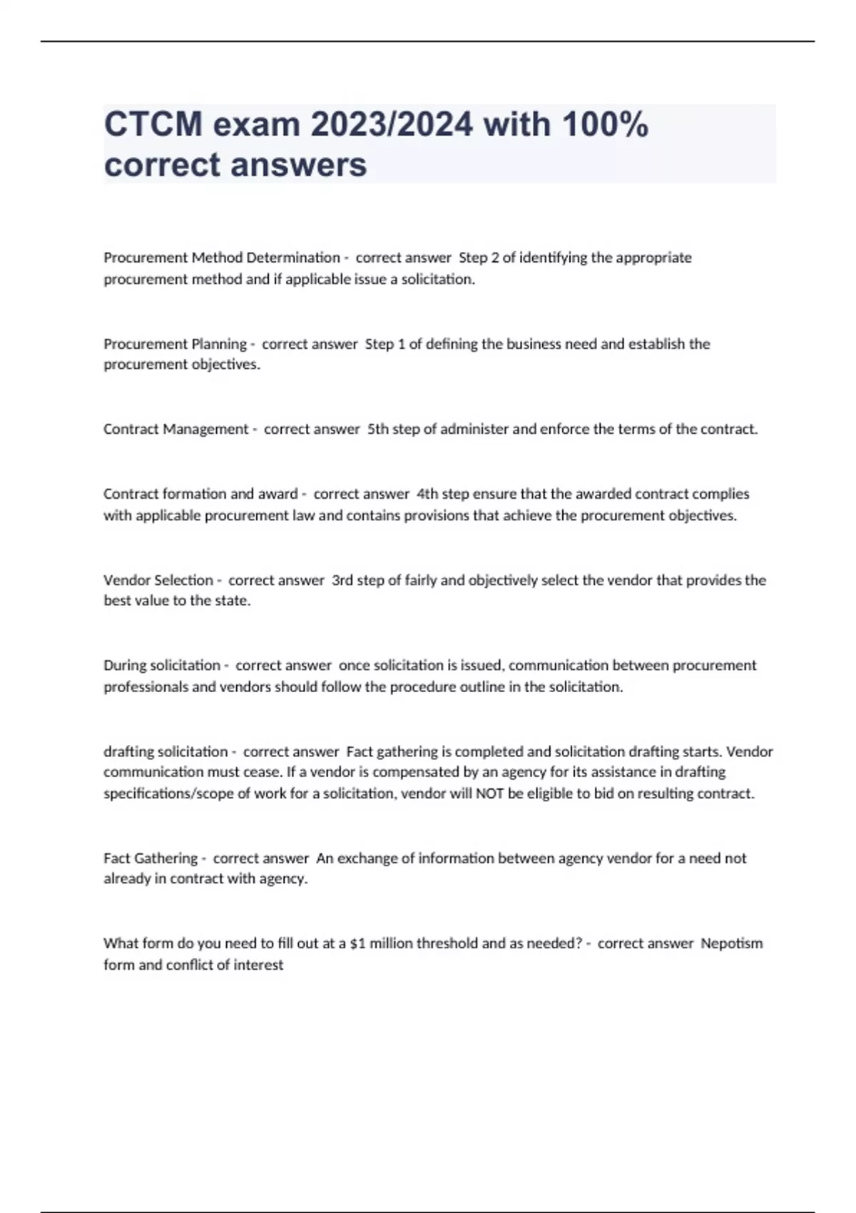 Procurement Method Determination - correct answer Step 2 of identifying the appropriate procurement method and if applicable issue a solicitation. Procurement Planning - correct answer Step 1 of defining the business need and establish the procurement objectives. Contract Management - correct answer 5th step of administer and enforce the terms of the contract. Contract formation and award - correct answer 4th step ensure that the awarded contract complies with applicable procurement law and contains provisions that achieve the procurement objectives. Vendor Selection - correct answer 3rd step of fairly and objectively select the vendor that provides the best value to the state. During solicitation - correct answer once solicitation is issued, communication between procurement professionals and vendors should follow the procedure outline in the solicitation. drafting solicitation - correct answer Fact gathering is completed and solicitation drafting starts. Vendor communication must cease. If a vendor is compensated by an agency for its assistance in drafting specifications/scope of work for a solicitation, vendor will NOT be eligible to bid on resulting contract. Fact Gathering - correct answer An exchange of information between agency vendor for a need not already in contract with agency. What form do you need to fill out at a $1 million threshold and as needed? - correct answer Nepotism form and