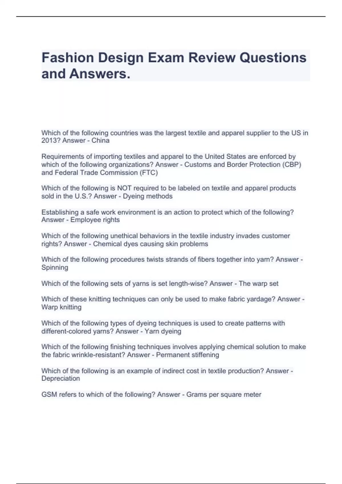 Fashion Design Exam Review Questions and Answers.
