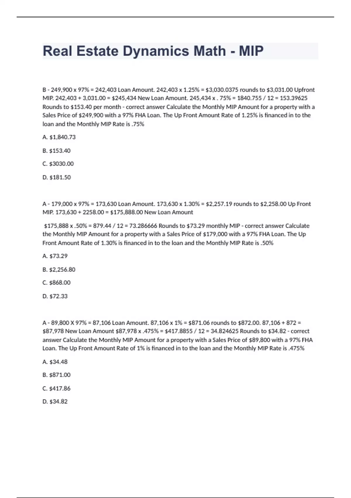 Real Estate Dynamics Math - MIP Question and answers rated A+ 2023/2024 B - 249,900 x 97% = 242,403 Loan Amount. 242,403 x 1.25% = $3,030.0375 rounds to $3,031.00 Upfront MIP. 242,403 + 3,031.00 = $245,434 New Loan Amount. 245,434 x . 75% = 1840.755 / 12 = 153.39625 Rounds to $153.40 per month - correct answer Calculate the Monthly MIP Amount for a property with a Sales Price of $249,900 with a 97% FHA Loan. The Up Front Amount Rate of 1.25% is financed in to the loan and the Monthly MIP Rate is .75% A. $1,840.73 B. $153.40 C. $3030.00 D. $181.50 A - 179,000 x 97% = 173,630 Loan Amount. 173,630 x 1.30% = $2,257.19 rounds to $2,258.00 Up Front MIP. 173,630 + 2258.00 = $175,888.00 New Loan Amount $175,888 x .50% = 879.44 / 12 = 73.286666 Rounds to $73.29 monthly MIP - correct answer Calculate the Monthly MIP Amount