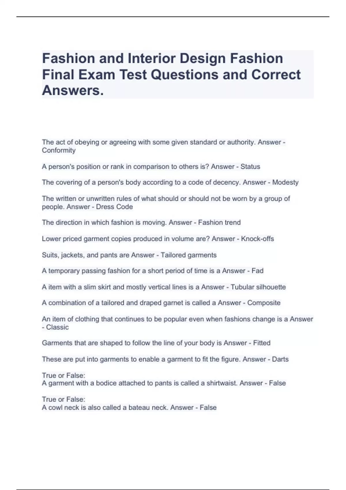 Fashion and Interior Design Fashion Final Exam Test Questions and Correct Answers.