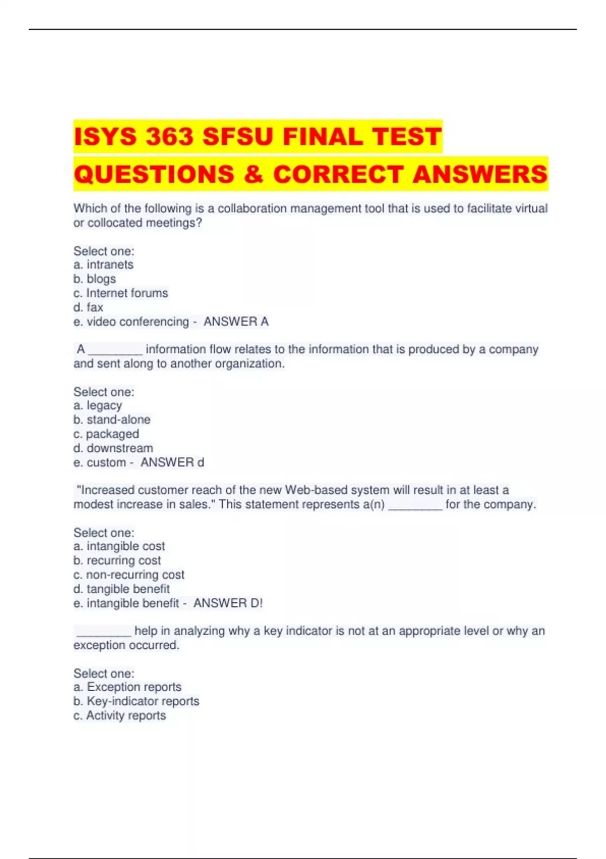 ISYS 363 SFSU FINAL TEST QUESTIONS & CORRECT ANSWERS Which of the following is a collaboration management tool that is used to facilitate virtual or collocated meetings? Select one: a. intranets b. blogs c. Internet forums d. fax e. video conferencing - ANSWER A A ________ information flow relates to the information that is produced by a company and sent along to another organization. Select one: a. legacy b. stand-alone c. packaged d. downstream e. custom - ANSWER d "Increased customer reach of the new Web-based system will result in at least a modest increase in sales." This statement represents a(n) ________ for the company. Select one: a. intangible cost b. recurring cost c. non-recurring cost d. tangible benefit e. intangible benefit - ANSWER D! ________ help in analyzing why a key indicator is not at an appropriate level or why an exception occurred. Select one: a. Exception reports b. Key-indicator reports c. Activity reports d. Drill-down reports e. Scheduled reports - ANSWER D A ________ is a business document containing some predefined data, often including some areas where additional data can be filled in. Select one: a. report b. sheet c. script d. form e. module - ANSWER D Which of the following statements is true about an information system? Select one: a. It consists of narrow and simple updates and queries. b. Its design goal is to enhance ease of access and use. c. Its primary purpose is to run the business on a current basis. d. It is primarily used by online customers, clerks, salespersons, and administrators. e. Its design goal is to enhance performance. - ANSWER b? Which of the following is a role of data mining agents? Select one: a. assembling customized news b. finding the best price for a particular product a user wants to purchase c. sending a report at the first of the month automatically d. tracking inventory levels e. analyzing data warehouses to detect changes deemed important by a user - ANSWER e Microsoft's Exchange/Outlook and Lotus Notes provide people with e-mail, automated calendaring, and online, threaded discussions, enabling close contact with others, regardless of their location. Identify this type of information system. Select one: a. collaboration system b. data mining and visualization system c. office automation system d. functional area information system e. geographic information system - ANSWER A ________ allows using approximations or subjective values to handle situations where information about a problem is incomplete. Select one: a. Stickiness b. Fuzzy logic c. What-if analysis d. Normalization e. Clustering - ANSWER b Which of the following is likely to have the suffix ".org" after the domain name in its URL? Select one: a. The Federal Bureau of Investigation b. The Red Cross Society c. Starbucks d. Harvard Business School e. McDonalds - ANSWER b The most prominent type of system software, the ________, coordinates the interaction between hardware components, peripherals, application software, and users. Select one: a. read-only memory b. point to point protocol c. operating system d. random-access memory e. base station - ANSWER c