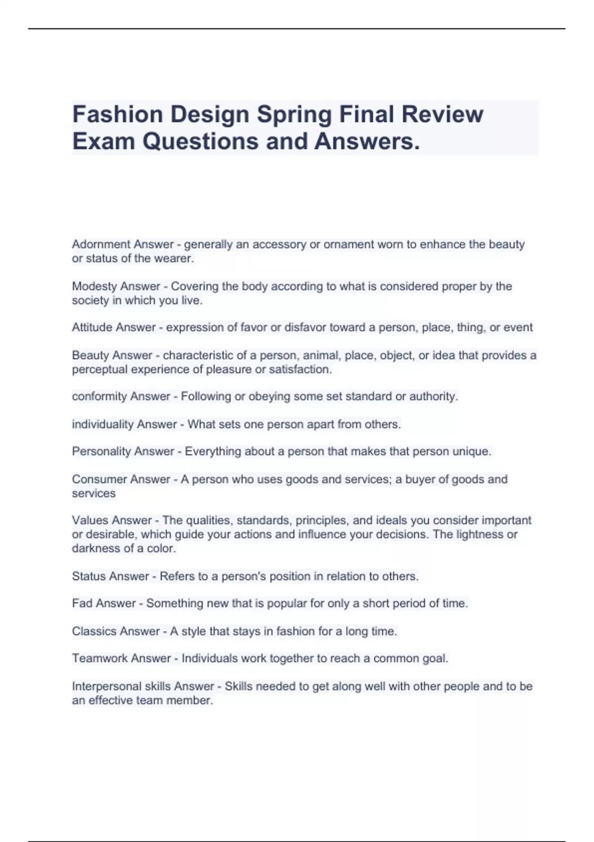 Fashion Design Spring Final Review Exam Questions and Answers.
