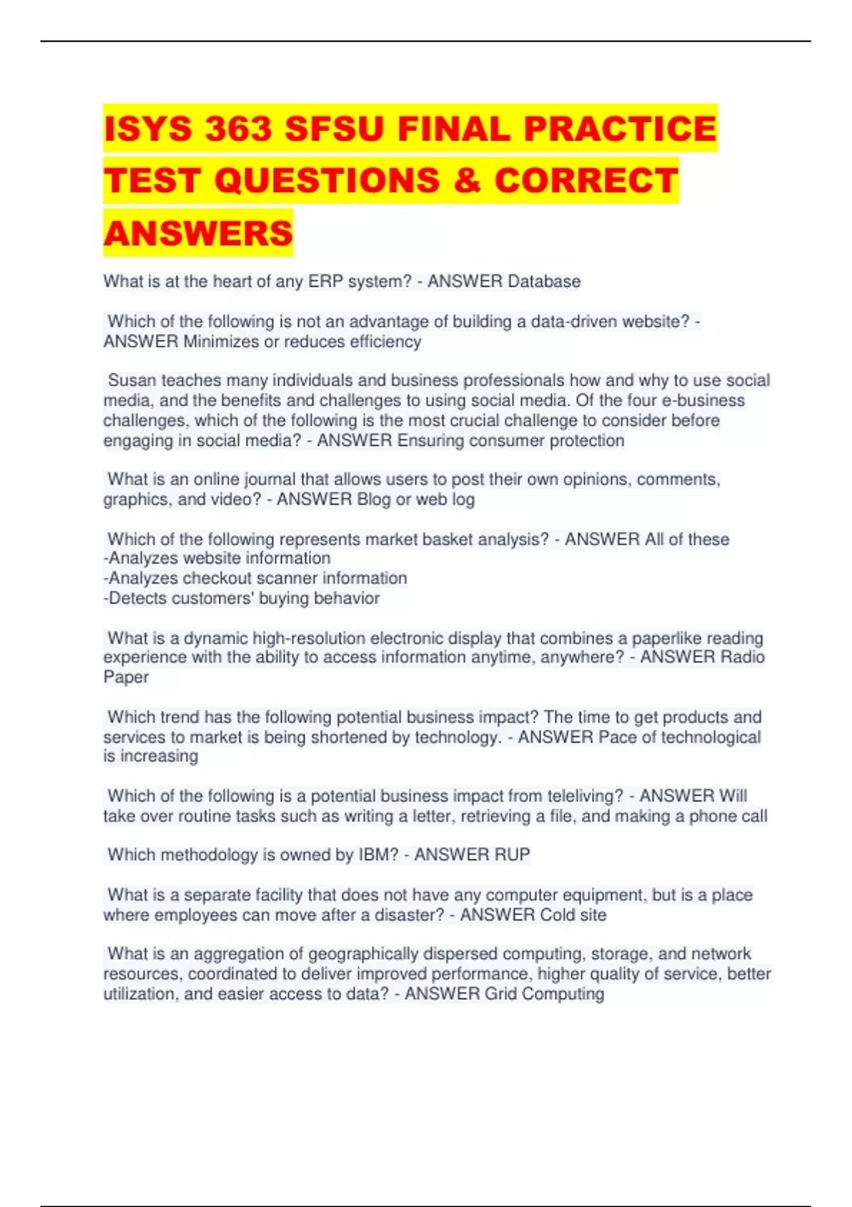 ISYS 363 SFSU FINAL PRACTICE TEST QUESTIONS & CORRECT ANSWERS What is at the heart of any ERP system? - ANSWER Database Which of the following is not an advantage of building a data-driven website? - ANSWER Minimizes or reduces efficiency Susan teaches many individuals and business professionals how and why to use social media, and the benefits and challenges to using social media. Of the four e-business challenges, which of the following is the most crucial challenge to consider before engaging in social media? - ANSWER Ensuring consumer protection What is an online journal that allows users to post their own opinions, comments, graphics, and video? - ANSWER Blog or web log Which of the following represents market basket analysis? - ANSWER All of these -Analyzes website information -Analyzes checkout scanner information -Detects customers' buying behavior What is a dynamic high-resolution electronic display that combines a paperlike reading experience with the ability to access information anytime, anywhere? - ANSWER Radio Paper Which trend has the following potential business impact? The time to get products and services to market is being shortened by technology. - ANSWER Pace of technological is increasing Which of the following is a potential business impact from teleliving? - ANSWER Will take over routine tasks such as writing a letter, retrieving a file, and making a phone call Which methodology is owned by IBM? - ANSWER RUP What is a separate facility that does not have any computer equipment, but is a place where employees can move after a disaster? - ANSWER Cold site What is an aggregation of geographically dispersed computing, storage, and network resources, coordinated to deliver improved performance, higher quality of service, better utilization, and easier access to data? - ANSWER Grid Computing What is an ISP? - ANSWER Internet service provider, a company that provides access to the Internet for a monthly fee. What is measured by such benchmarks as satisfaction surveys, percentage of existing customers retained, and increases in revenue dollars per customer? - ANSWER Customer satisfaction What is used to create an application that is helpful in designing business process models and also helpful in simulating, optimizing, monitoring, and maintaining various processes that occur within an organization? - ANSWER Business process management tools Which of the following is a question a company should ask when creating a global website? - ANSWER All of these -Will the site require new navigational logic to accommodate cultural preferences? -Will content be translated? -Which country will the server be located in to support local user needs? Which of the following can a customer use to contact an organization? - ANSWER All of these -Telephone -Email -Web access What describes how products in a network increase in value to users as the number of users increase? - ANSWER Network effect Which of the following best describes Web 2.0? - ANSWER Social media and usergenerated web content Consider a washing machine as a system. Which of the following represents the process? - ANSWER The wash and rinse cycle. What consists of a series of tiny projects? - ANSWER Iterative development What are some of the immediate results businesses found from using instant messaging? - ANSWER All of these -Quickly identify which employees are at their computers. -Easily hold simultaneous IM sessions with multiple people. -Resolve questions or problems immediately. What is a method for confirming users' identities? - ANSWER Authentication What is a detailed process for recovering information or an IT system in the event of a catastrophic disaster such as a fire or flood? - ANSWER Disaster recovery plan