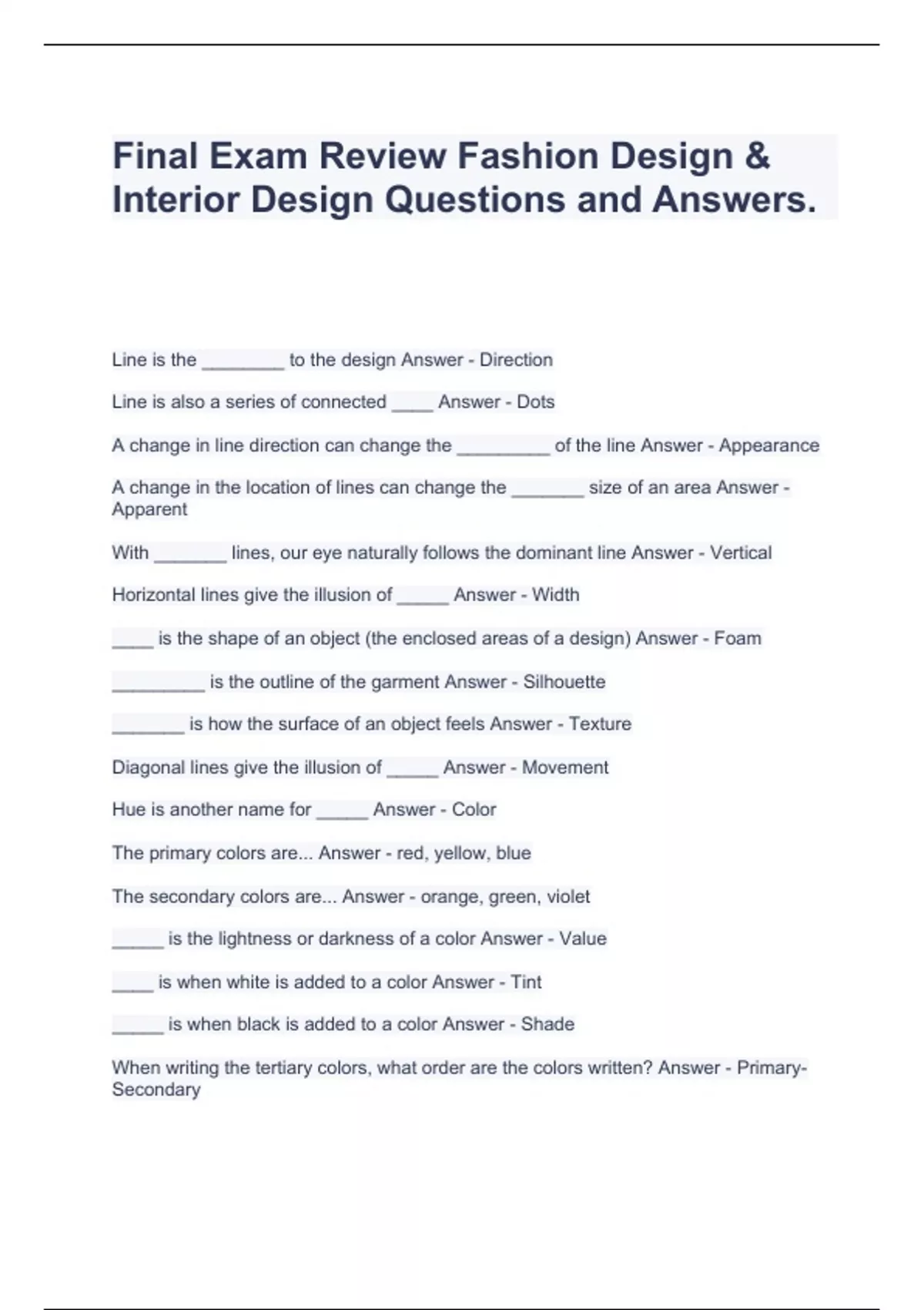 Final Exam Review Fashion Design & Interior Design Questions and Answers.