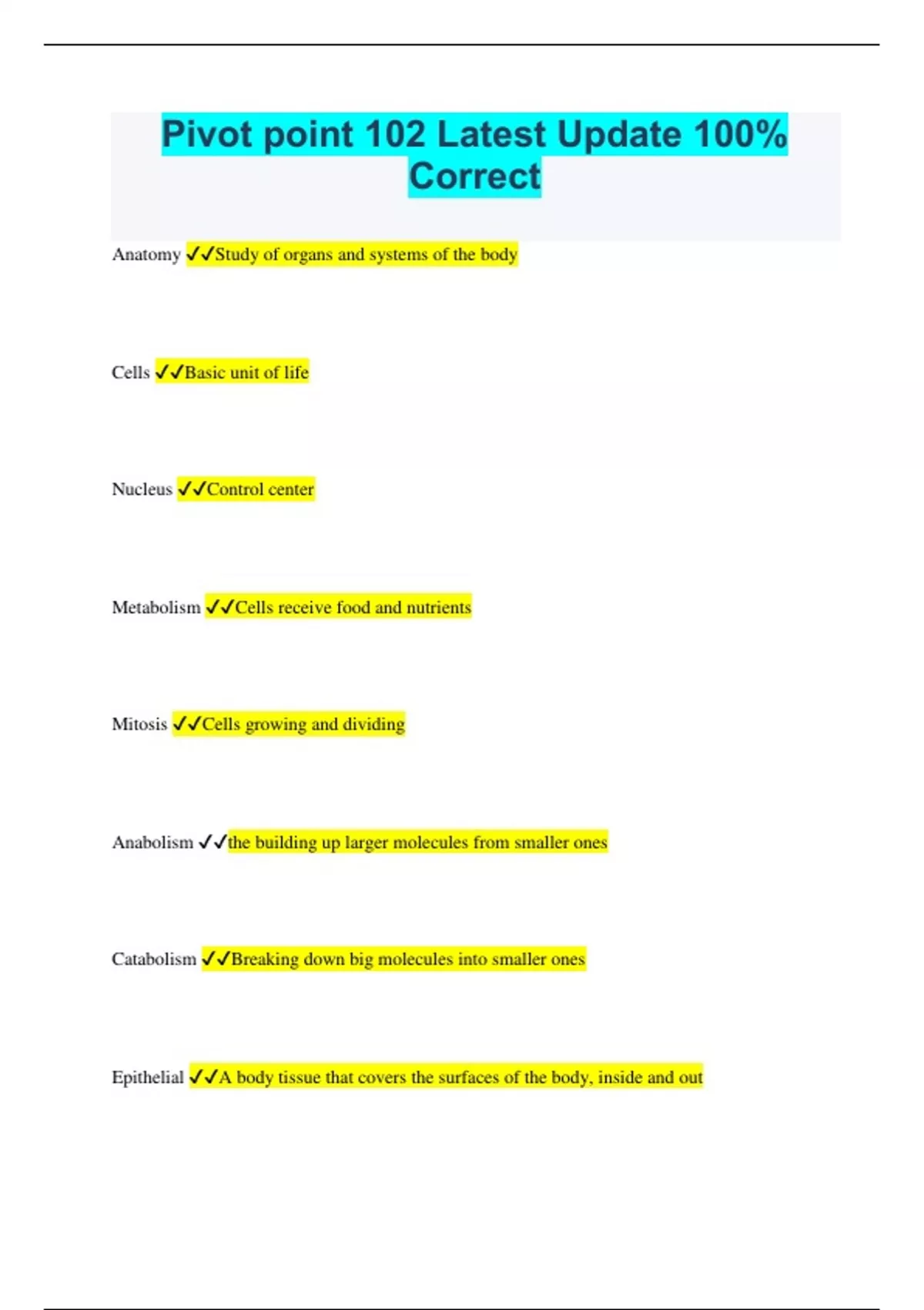 Pivot point 102 Latest Update 100% Correct Anatomy Study of organs and systems of the body Cells Basic unit of life Nucleus Control center Metabolism Cells receive food and nutrients Mitosis Cells growing and dividing Anabolism the building up larger molecules from smaller ones Catabolism Breaking down big molecules into smaller ones Epithelial A body tissue that covers the surfaces of the body, inside and out Connective tissue Protects and supports the body and connects all of its parts Nerve tissue Coordinates body functions and carries messages to and from brain & spinal cord Muscular tissue Contracts when stimulated to produce motion Liquid tissue Carries food, waste products and hormones. Organs Groups of tissues that work together to perform a specific function Brain Controls all body functions Heart Circulates blood Lungs Supply the blood with oxygen Stomach/ intestins Digest food Liver Removes waste created by digestion Kidneys Eliminate water and waste products Skin largest organ of the body puts a protective layer over body System Group of body structures that perform one or more vital functiona Skeletal Provides framework for body Muscular Moves the body Circulatory Circulates blood through the body Nervous Sends and receives body messages Digestive Supplies food to the body Excretory Removes waste Respritory Controls breathing Endocrine Controls growth, general health and reproduction Reproductive Allows living things to procreate Integumentary Controls sebaceous (oil) and sudoriferous (sweat) glands Skeletal system Gives body shape /strength. Protects internal organs and provides a frame for muscles and body movements. Scalp massage 6 bones are affected during this Mandible lower jaw bone largest bone of face Maxillae the two bones forming the upper jaw Nasal 2 bones form the bridge of the nose Zygomatic/Malar 2 bones form upper cheek and bottom eye sockets Lacrimal Smallest 2 bones on the face form the inner part of the eye socket Vertical vertebrae 7 bones form the top part of the spinal column. Involved in extended scalp massage. Hyoid a U-shaped bone at the base that supports the tongue. Humerous Largest bone of upper arm from elbow to shoulder Radius Long Bone on the thumb side of lower forearm Ulna Long bone in forearm - little finger to elbow Carpals 8 small bones that are held together by ligaments to form wrist/carpus Metacarpals 5 long thin bones form the palm of the hand Phalanges 14 bones that form the digits or fingers. Each finger has 3 phalanges the thumb has 2 Thoracic vertebrae 12 vertebrae in the chest region that form the center of the spine Sternum the breastbone Ribs 12 pairs of curved bones from throat to shoulders on the right and left side Clavicle Collar bone Scapula shoulder blade attaches to clavicle Femer Thigh bone longest bone in body Patella Kneecap Tibia Shinbone from knee to ankle Fibula The smaller bone of the lower leg Talus ankle Tarsals 7 bones Make up mid-foot and rear foot Metatarsals 14 foot bones that form the toes Myology study of muscles Voluntary/striated Muscles that respond to commands regularly by will Involuntary/non-striated Muscles respond automatically to control different body functions including functions of internal organs Orgin Non moving fixed portion of the muscle Belly The middle part of the muscle. Insertion The portion of the muscle joined to movable attachments Anterior In front of Posterior Behind/ in back of Superioris Located above or is larger Inferioris Below or is smaller Levator Lifts up Depressor Draws down/ depresses Dilator Opens enlarges or expands Orbicularis oculi closes eye circles the eye socket orbicularis oris Circles the mouth closes lips Quadratus Labii Superioris 3 parts above upper lip Buccinator Between jaws and cheek compresses cheeks Platysma Tip of the chin to shoulders and chest draws lower lip sideways Sternocleidomastoid Moves head side to side from side of neck from ear to collarbone Trapezius Upper and back part of neck/shoulders draws the head back Supinator Turns palm of hand up Extensor Mid forearm straightens fingers and wrist Abductor Separates fingers Adductor Draws the fingers together Circulatory/ vascular system Controls the circulation of blood and lymph through body Adult blood 8-10 pints Red blood cells (Erythrocytes) White blood cells Leukocytes Arteries carry blood away from the heart Veins carry blood to the heart General Circulation Blood travels from the heart throughout the body and back common carotid artery Split into internal and external cartoid arteries Occipital Supplies blood to back of head and crown Pariental Supplies blood to sides of the head Ulnar Supplies blood to little finger and side of forearm Radial Supplies blood to thumb hand and side of forearm Lymph Colorless liquid made by plasma passing nourishment filter foreign particles Nervous system Peripheral central and autonomic Central nervous system Brain spinal cord and spinal nerves Spinal cord Long nerve fibers starts from base of brain down spine Nerve cells Have a nucleus cytoplasm and membrane Dendrites Bring info and messages to the cell body Trifacial Chief sensory nerve Facial nerve Brain at the lower part of ear primary motor neeve of the brain Posterior auricular Muscles behind and below the ear Temporal Temples sides of forehead and eyebrows eyelids and upper cheek Buccal Muscles of the mouth autonomic nervous system Responsible for all involuntary body functions Respiratory system Take in oxygen Lungs Air when u inhale Diaphragm Seperates chest from abdomen Endocrine System regulate and control growth reproduction and health
