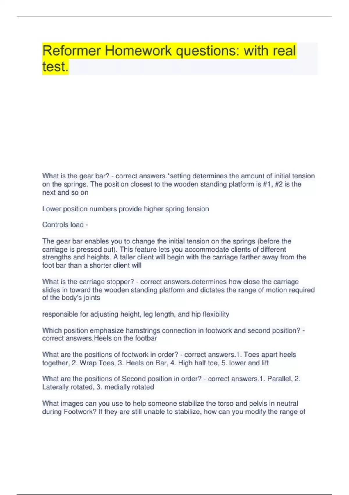 Reformer Homework questions: with real test. What is the gear bar? - correct answers.*setting determines the amount of initial tension on the springs. The position closest to the wooden standing platform is #1, #2 is the next and so on Lower position numbers provide higher spring tension Controls load - The gear bar enables you to change the initial tension on the springs (before the carriage is pressed out). This feature lets you accommodate clients of different strengths and heights. A taller client will begin with the carriage farther away from the foot bar than a shorter client will What is the carriage stopper? - correct mines how close the carriage slides in toward the wooden standing platform and dictates the range of motion required of the body's joints responsible for adjusting height, leg length, and hip flexibility Which position emphasize hamstrings connection in footwork and second position? - correct answers.Heels on the footbar What are the positions of footwork in order? - correct answers.1. Toes apart heels together, 2. Wrap Toes, 3. Heels on Bar, 4. High half toe, 5. lower and lift What are the positions of Second position in order? - correct answers.1. Parallel, 2. Laterally rotated, 3. medially rotated What images can you use to help someone stabilize the torso and pelvis in neutral during Footwork? If they are still unable to stabilize, how can you modify the range of