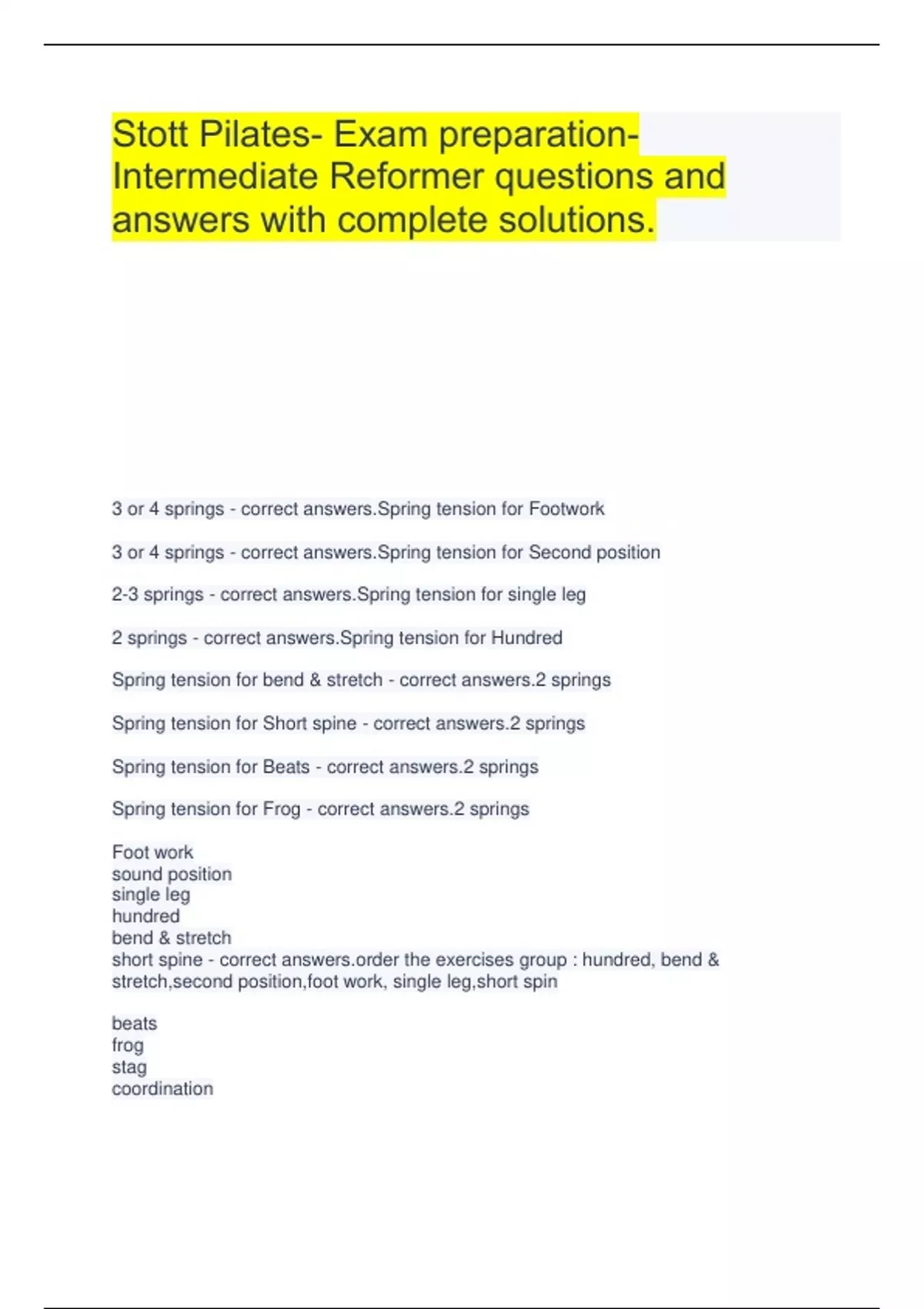 Stott Pilates- Exam preparation- Intermediate Reformer questions and answers with complete solutions. 3 or 4 springs - correct answers.Spring tension for Footwork 3 or 4 springs - correct answers.Spring tension for Second position 2-3 springs - correct answers.Spring tension for single leg 2 springs - correct answers.Spring tension for Hundred Spring tension for bend & stretch - correct answers.2 springs Spring tension for Short spine - correct answers.2 springs Spring tension for Beats - correct answers.2 springs Spring tension for Frog - correct answers.2 springs Foot work sound position single leg hundred bend & stretch short spine - correct the exercises group : hundred, bend & stretch,second position,foot work, single leg,short spin beats frog stag coordination back rowing 1,2 front rowing 1,2,3,4 - correct the exercises group: stag front rowing 1,2,3,4 coordination beats frog back rowing 1,2 Stomach massage Arms pulling strap- long box 1,2,3 Back stroke prep long box Feet puling straps - short box 1,2,3,4 Round back - short box Straight back - short box Twist with round - short box Lean- short box Tree- short box Mermaid - short box 1,2,3 - correct the exercises group: Mermaid - short box 1,2,3 Twist with round - short box Feet puling straps - short box 1,2,3,4 Stomach massage Back stroke prep long box Arms pulling strap- long box 1,2,3 Round back - short box Straight back - short box Lean- short box Tree- short box Long stretch prep Down stretch Up stretch 1 Elephant 1,2 Semicircle Chest expansion1,2 Side Arm Prep kneeling 1,2,3,4,5,6,7 Side twist kneeling - correct the exercises group: Up stretch 1 Semicircle Chest expansion1,2 Side Arm Prep kneeling 1,2,3,4,5,6,7 Side twist kneeling Long stretch prep Down stretch Elephant 1,2