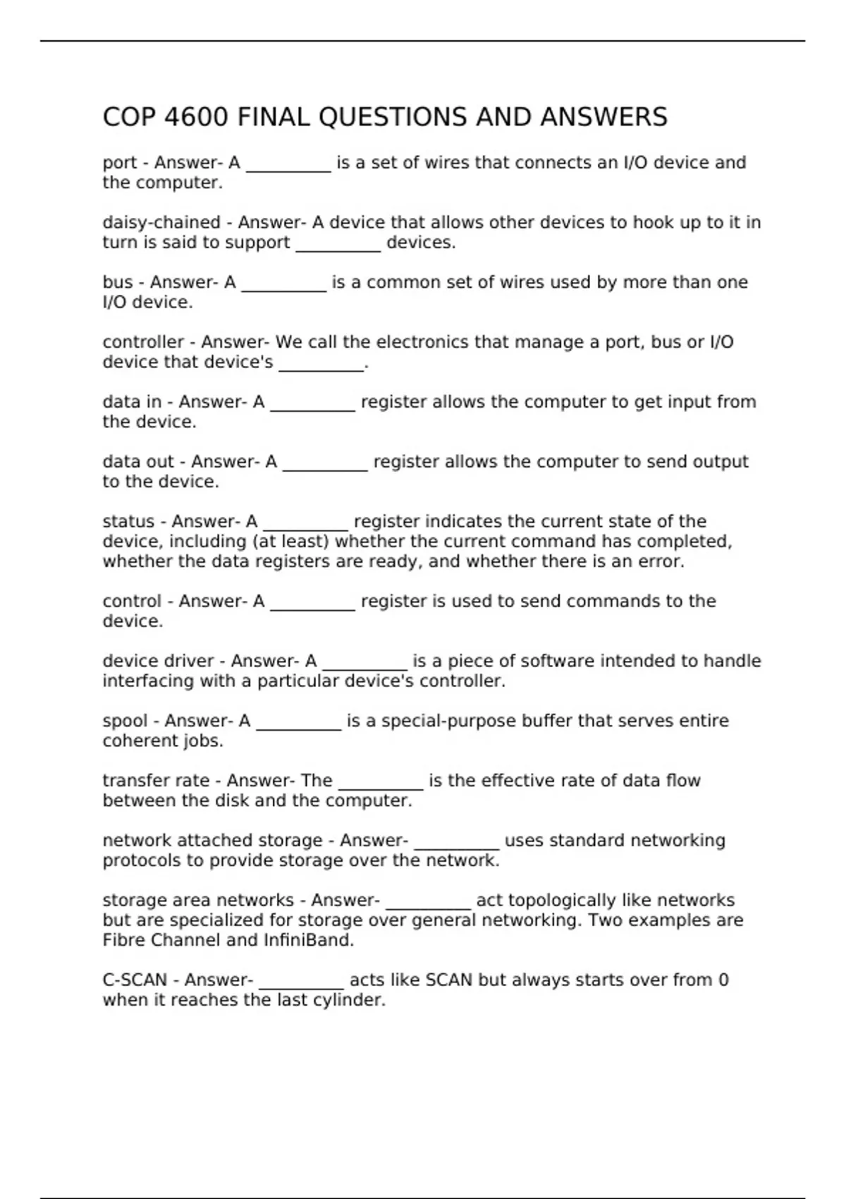 port - Answer- A __________ is a set of wires that connects an I/O device and the computer. daisy-chained - Answer- A device that allows other devices to hook up to it in turn is said to support __________ devices. bus - Answer- A __________ is a common set of wires used by more than one I/O device. controller - Answer- We call the electronics that manage a port, bus or I/O device that device's __________. data in - Answer- A __________ register allows the computer to get input from the device. data out - Answer- A __________ register allows the computer to send output to the device. status - Answer- A __________ register indicates the current state of the device, including (at least) whether the current command has completed, whether the data registers are ready, and whether there is an error. control - Answer- A __________ register is used to send commands to the device. device driver - Answer- A __________ is a piece of software intended to handle interfacing with a particular device's controller. spool - Answer- A __________ is a special-purpose buffer that serves entire coherent jobs. transfer rate - Answer- The __________ is the effective rate of data flow between the disk and the computer. network attached storage - Answer- __________ uses standard networking protocols to provide storage over the network. s