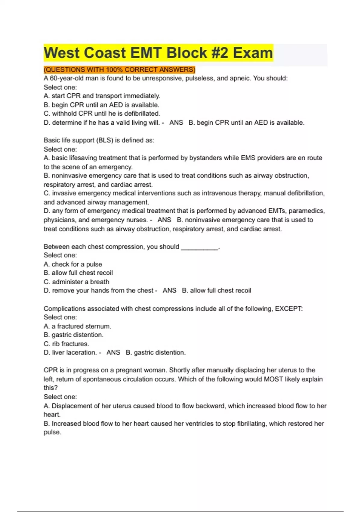 West Coast EMT Block #2 Exam NEWEST 2024 (QUESTIONS WITH 100% CORRECT ANSWERS