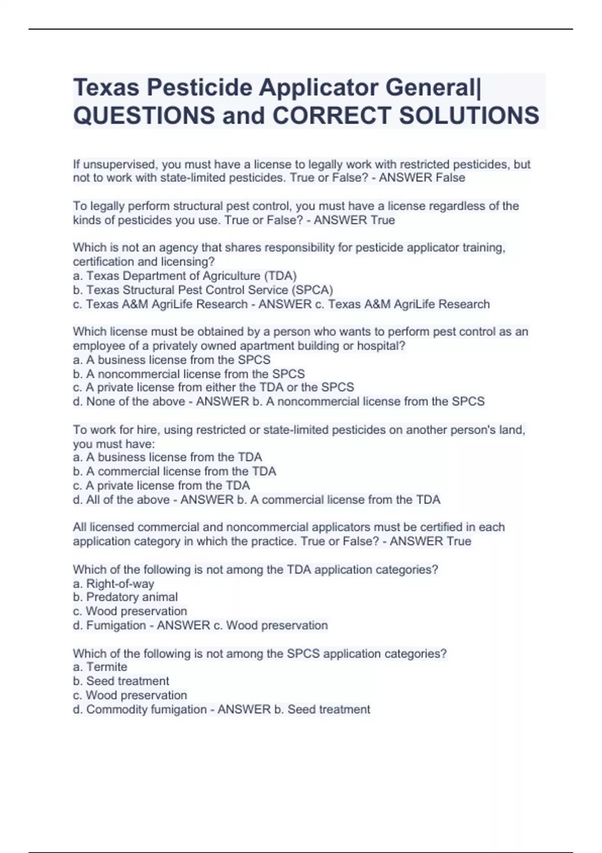 If unsupervised, you must have a license to legally work with restricted pesticides, but not to work with state-limited pesticides. True or False? - ANSWER False To legally perform structural pest control, you must have a license regardless of the kinds of pesticides you use. True or False? - ANSWER True Which is not an agency that shares responsibility for pesticide applicator training, certification and licensing? a. Texas Department of Agriculture (TDA) b. Texas Structural Pest Control Service (SPCA) c. Texas A&M AgriLife Research - ANSWER c. Texas A&M AgriLife Research Which license must be obtained by a person who wants to perform pest control as an employee of a privately owned apartment building or hospital? a. A business license from the SPCS b. A noncommercial license from the SPCS c. A private license from either the TDA or the SPCS d. None of the above - ANSWER b. A noncommercial license from the SPCS To work for hire, using restricted or state-limited pesticides on another person's land, you must have: a. A business license from the TDA b. A commercial license from the TDA c. A private license from the TDA d. All of the above - ANSWER b. A commercial license from the TDA All licensed commercial and noncommercial applicators must be certified in each application category in which the practice. True or False? - ANSWER True Which of the following is not among the TDA application categories? a. Right-of-way b. Predatory animal c. Wood preservation d. Fumigation - ANSWER c. Wood preservation Which of the following is not among the SPCS application categories? a. Termite b. Seed treatment c. Wood preservation d. Commodity fumigation - ANSWER b. Seed treatment "Quinclorac", "Dicamba (2,4-D)", "Propanil (2,4-DB)", "Bromacil (2,4-DP)", and "Prometon (MCPA)" are all examples of what? - ANSWER Type 1 State-Limited-Use (SLU) Pesticides "Sodium Floroacetate (Compound 1080)" and "Sodium Cyanide (M-44)" are both examples of what? - ANSWER Type 2 State-Limited-Use Predacides These are rules set by the TDA to enforce the Texas Pesticide Law - ANSWER Texas Pesticide Regulations Which 4 State-Limited-Use pesticides are more volatile? - ANSWER 2,4-D Dicamba MCPA Quinclorac This law authorizes the SPCS to certify and license persons engaged in structural pest control, and also directs the SPCS to set rules on structural pest control methods that affect public health and welfare. - ANSWER Texas Structural Pest Control Act What's the true name of the Texas Hazardous Waste Materials Law? - ANSWER Texas Solid Waste Disposal Act Which of the following state agencies is not involved in pesticide regulation? a. Texas Department of Agriculture b. Texas A&M AgriLife Extension Service