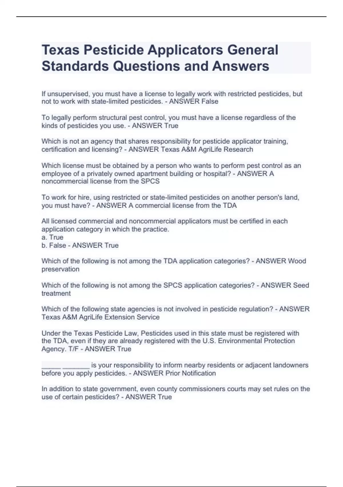 If unsupervised, you must have a license to legally work with restricted pesticides, but not to work with state-limited pesticides. - ANSWER False To legally perform structural pest control, you must have a license regardless of the kinds of pesticides you use. - ANSWER True Which is not an agency that shares responsibility for pesticide applicator training, certification and licensing? - ANSWER Texas A&M AgriLife Research Which license must be obtained by a person who wants to perform pest control as an employee of a privately owned apartment building or hospital? - ANSWER A noncommercial license from the SPCS To work for hire, using restricted or state-limited pesticides on another person's land, you must have? - ANSWER A commercial license from the TDA All licensed commercial and noncommercial applicators must be certified in each application category in which the practice. a. True b. False - ANSWER True Which of the following is not among the TDA application categories? - ANSWER Wood preservation Which of the following is not among the SPCS application categories? - ANSWER Seed treatment Which of the following state agencies is not involved in pesticide regulation? - ANSWER Texas A&M AgriLife Extension Service Under the Texas Pesticide Law, Pesticides used in this state must be registered with the TDA, even if they are already registered with the U.S. Environmental Protection Agency. T/F - ANSWER True _____ _______ is your responsibility to inform nearby residents or adjacent landowners before you apply pesticides. - ANSWER Prior Notification In addition to state government, even county commissioners courts may set rules on the use of certain pesticides? - ANSWER True Even with a commercial applicator license, you must still obtain a spray permit before using regulated herbicides. T/F - ANSWER True Specialty fertilizer in containers with capacities of 50 pounds or less that are labeled for ornamental and turf use are exempt from classification as state-limited-use pesticides or regulated herbicides. T/F - ANSWER True The Texas Structural Pest Control Act requires you to give public notice at least ______ hours before commencing indoor pesticide treatments at a public building. - ANSWER 48 Hours Which agency enforces the Texas Solid Waste Disposal Act? - ANSWER Texas Commission on Environmental Quality What is the full name and acronym of the federal agency that regulates pesticides? - ANSWER Environmental Protection Agency (EPA) What is the full name and acronym of the law used to manage pesticides? - ANSWER Federal Insecticide, Fungicide, and Rodenticide Act (FIFRA)