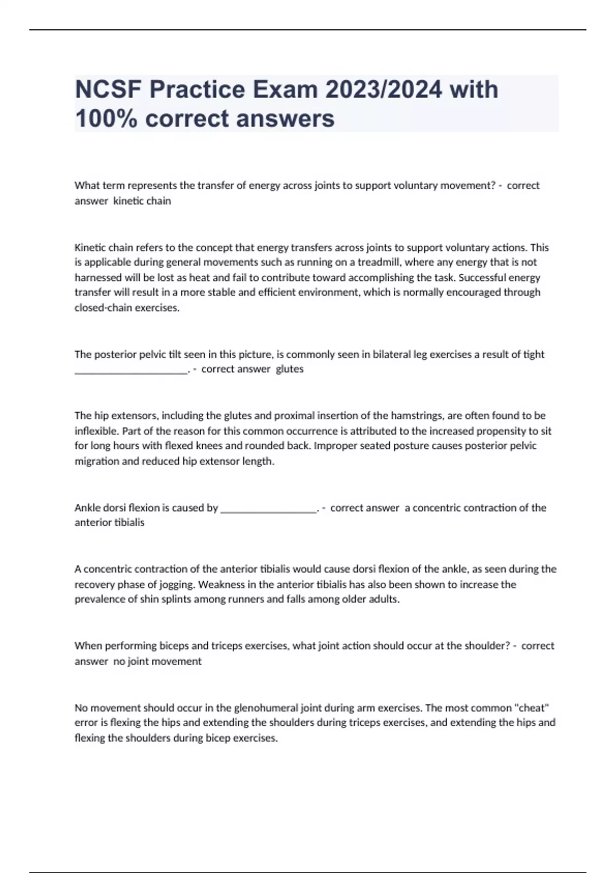 What term represents the transfer of energy across joints to support voluntary movement? - correct answer kinetic chain Kinetic chain refers to the concept that energy transfers across joints to support voluntary actions. This is applicable during general movements such as running on a treadmill, where any energy that is not harnessed will be lost as heat and fail to contribute toward accomplishing the task. Successful energy transfer will result in a more stable and efficient environment, which is normally encouraged through closed-chain exercises. The posterior pelvic tilt seen in this picture, is commonly seen in bilateral leg exercises a result of tight ____________________. - correct answer glutes The hip extensors, including the glutes and proximal insertion of the hamstrings, are often found to be inflexible. Part of the reason for this common occurrence is attributed to the increased propensity to sit for long hours with flexed knees and rounded back. Improper seated posture causes posterior pelvic migration and reduced hip extensor length. Ankle dorsi flexion is caused by _________________. - correct answer a concentric contraction of the anterior tibialis A concentric contraction of the anterior tibialis would cause dorsi flexion of the ankle, as seen during the recovery phase of jogging. Weakness in the anterior tibialis has also been shown to increase the prevalence of shin splints among runners and falls among older adults. When performing biceps and triceps exercises, what joint action should occur at the shoulder? - correct answer no joint movement No movement should occur in the glenohumeral joint during arm exercises. The most common "cheat" error is flexing the hips and extending the shoulders during triceps exercises, and extending the hips and flexing the shoulders during bicep exercises.