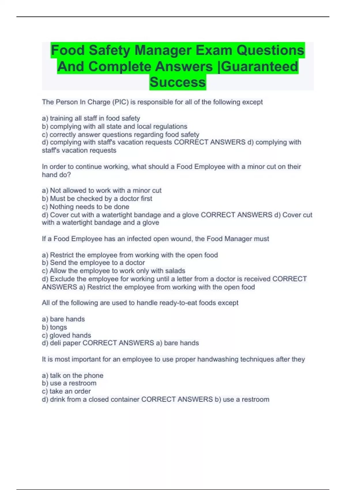 Food Safety Manager Exam Questions And Complete Answers