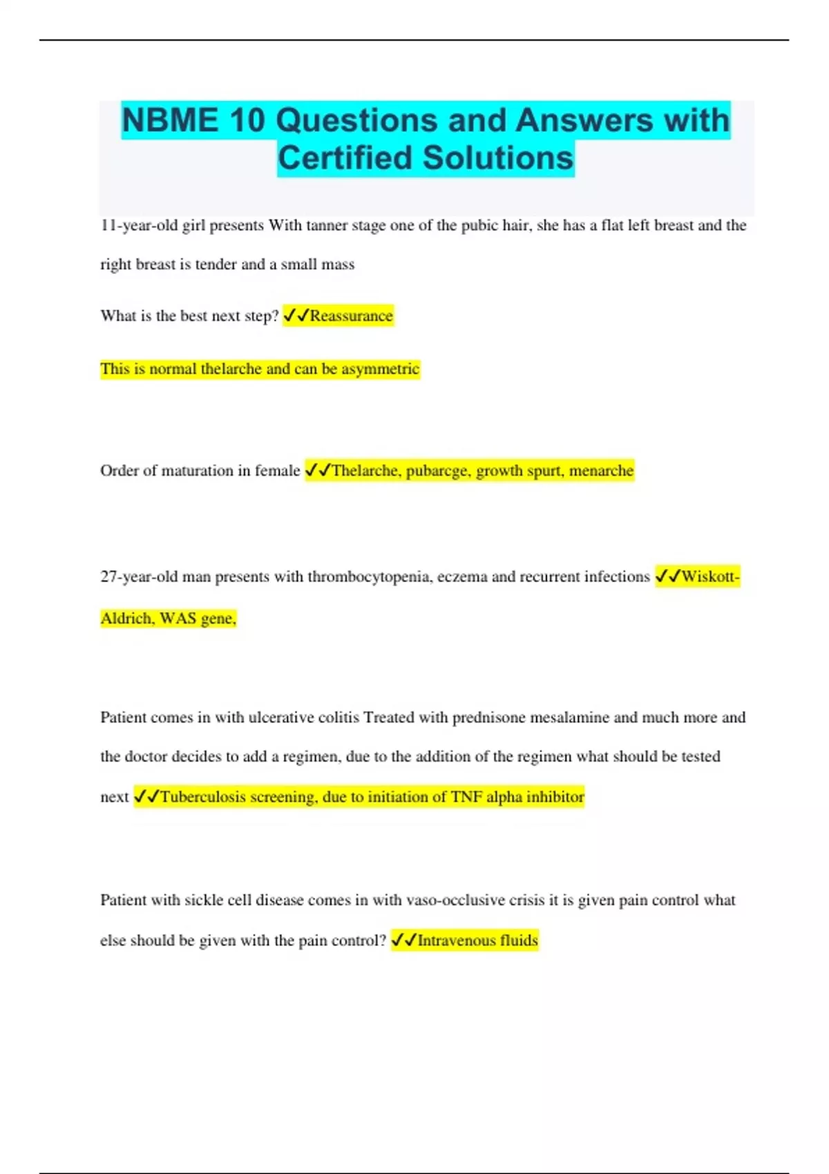 NBME 10 Questions and Answers with Certified Solutions 11-year-old girl presents With tanner stage one of the pubic hair, she has a flat left breast and the right breast is tender and a small mass What is the best next step? Reassurance This is normal thelarche and can be asymmetric Order of maturation in female Thelarche, pubarcge, growth spurt, menarche 27-year-old man presents with thrombocytopenia, eczema and recurrent infections Wiskott-Aldrich, WAS gene, Patient comes in with ulcerative colitis Treated with prednisone mesalamine and much more and the doctor decides to add a regimen, due to the addition of the regimen what should be tested next Tuberculosis screening, due to initiation of TNF alpha inhibitor Patient with sickle cell disease comes in with vaso-occlusive crisis it is given pain control what else should be given with the pain control? Intravenous fluids Patient with a MI 10 years ago Comes to the hospital due to vomiting. The patient ends up getting a transfusion and 30 minutes later starts developing shortness of breath, what is the most likely cause? Transfusion associated circulatory overload Remember: patience with ABO incompatibility present with flank pain and hypotension Treatment of transfusion associate circulatory overload Oxygen and positive pressure ventilation And possible directions Can lead to psychosis, bizarre behavior, agitation, aggression, nystagmus and ataxia treatment PCP intoxication Treatment: IM lorazepam or Midazolam 38-year-old woman comes in due to seizures, MRI demonstrates unilateral or bilateral temporal lobe abnormalities, what is the next best step? Lumbar puncture: HSV encephalitis If a patient has stroke like symptoms occurring less than 4 1/2 half hours Without signs of hemorrhage what is administered? Alteplase If the patient comes in with a stroke in the amount of time is unknown, with no evidence of hemorrhage what is administered? Aspirin instead of alteplase Bell's palsy Presents with facial nerve palsy causing facial paralysis that doesn't spread the forehead, what is the next best step? Treatment: It's diagnose clinically, no further testing indicated Treatment: glucocorticoids and occasionally antiviral therapy Patient after gastric bypass presents with ataxia, altered mental status and opthalmoplegia including nystagmus, most likely cause? Vit B1 def Immunocompetent child with cervical lymphadenitis presents with a purpleish hue, And presence of multiple granulomas on excisional biopsy Purpleish hue: mycobacterium infection Patient