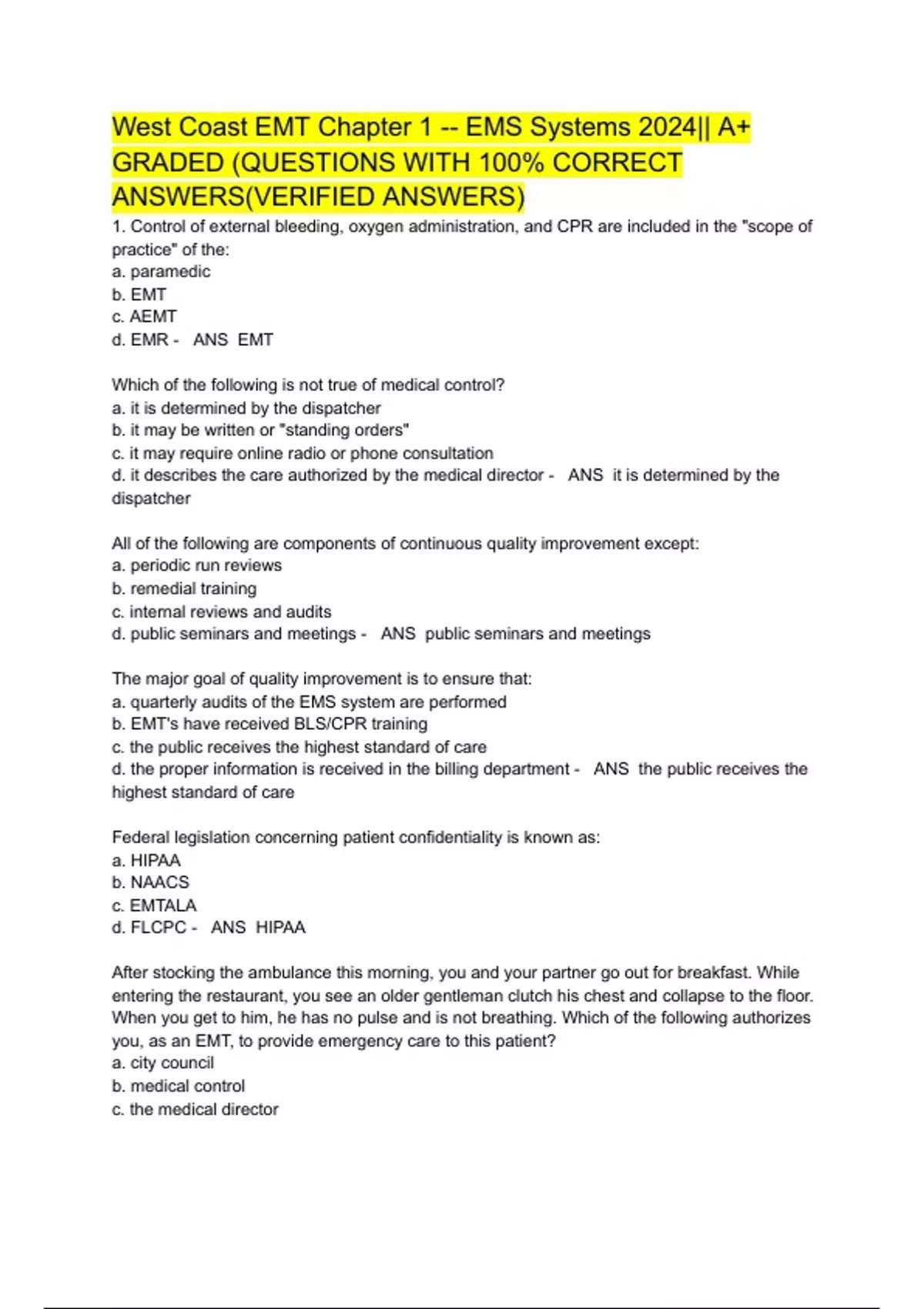 West Coast EMT Chapter 1 -- EMS Systems 2024|| A+ GRADED (QUESTIONS WITH 100% CORRECT ANSWERS(VERIFIED ANSWERS)
