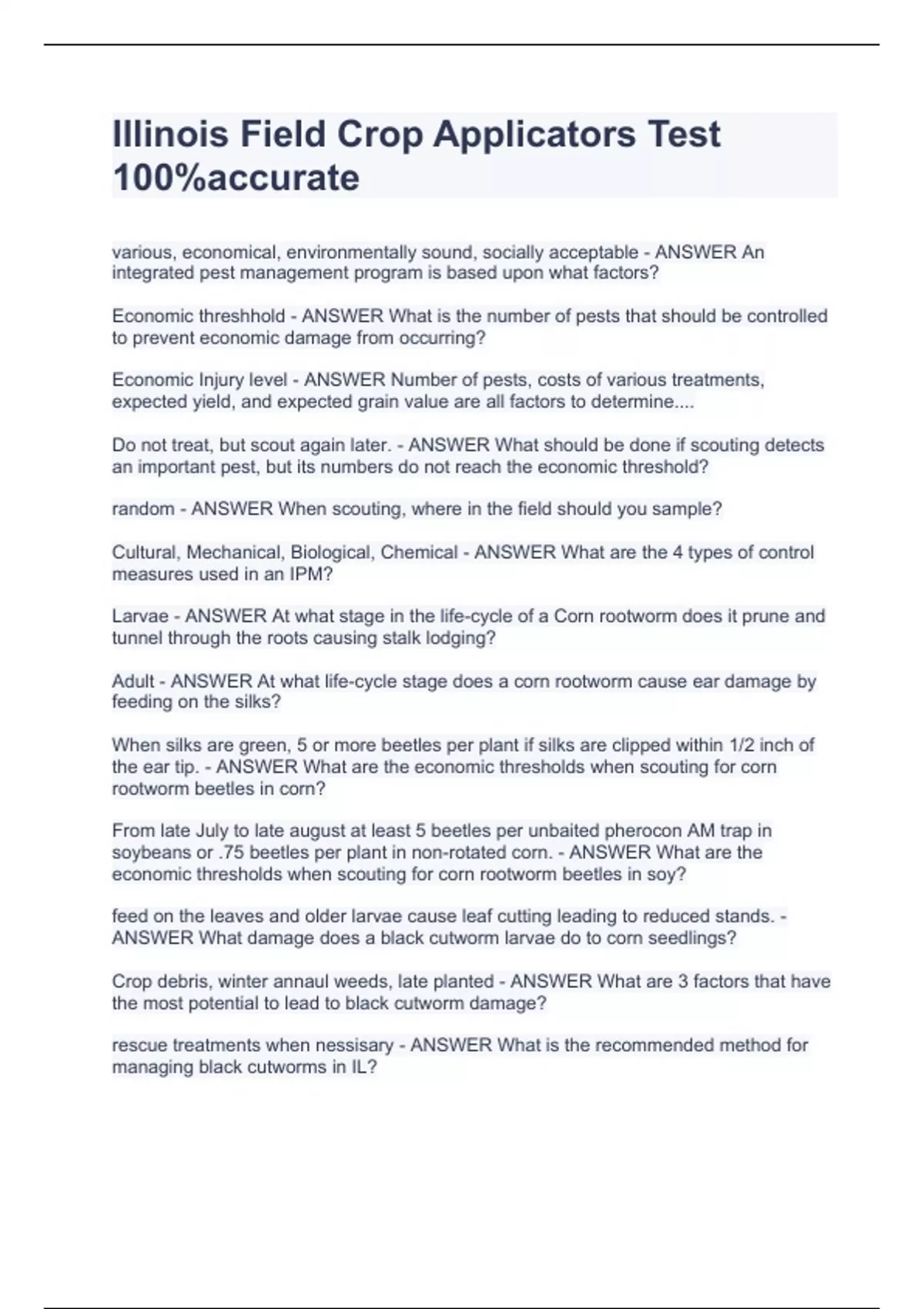 various, economical, environmentally sound, socially acceptable - ANSWER An integrated pest management program is based upon what factors? Economic threshhold - ANSWER What is the number of pests that should be controlled to prevent economic damage from occurring? Economic Injury level - ANSWER Number of pests, costs of various treatments, expected yield, and expected grain value are all factors to determine.... Do not treat, but scout again later. - ANSWER What should be done if scouting detects an important pest, but its numbers do not reach the economic threshold? random - ANSWER When scouting, where in the field should you sample? Cultural, Mechanical, Biological, Chemical - ANSWER What are the 4 types of control measures used in an IPM? Larvae - ANSWER At what stage in the life-cycle of a Corn rootworm does it prune and tunnel through the roots causing stalk lodging? Adult - ANSWER At what life-cycle stage does a corn rootworm cause ear damage by feeding on the silks? When silks are green, 5 or more beetles per plant if silks are clipped within 1/2 inch of the ear tip. - ANSWER What are the economic thresholds when scouting for corn rootworm beetles in corn? From late July to late august at least 5 beetles per unbaited pherocon AM trap in soybeans or .75 beetles per plant in non-rotated corn. - ANSWER What are the economic thresholds when scouting for corn rootworm beetles in soy? feed on the leaves and older larvae cause leaf cutting leading to reduced stands. - ANSWER What damage does a black cutworm larvae do to corn seedlings? Crop debris, winter annaul weeds, late planted - ANSWER What are 3 factors that have the most potential to lead to black cutworm damage? rescue treatments when nessisary - ANSWER What is the recommended method for managing black cutworms in IL? European corn borer - ANSWER What type of larvae causes whorl damage in 1st gene