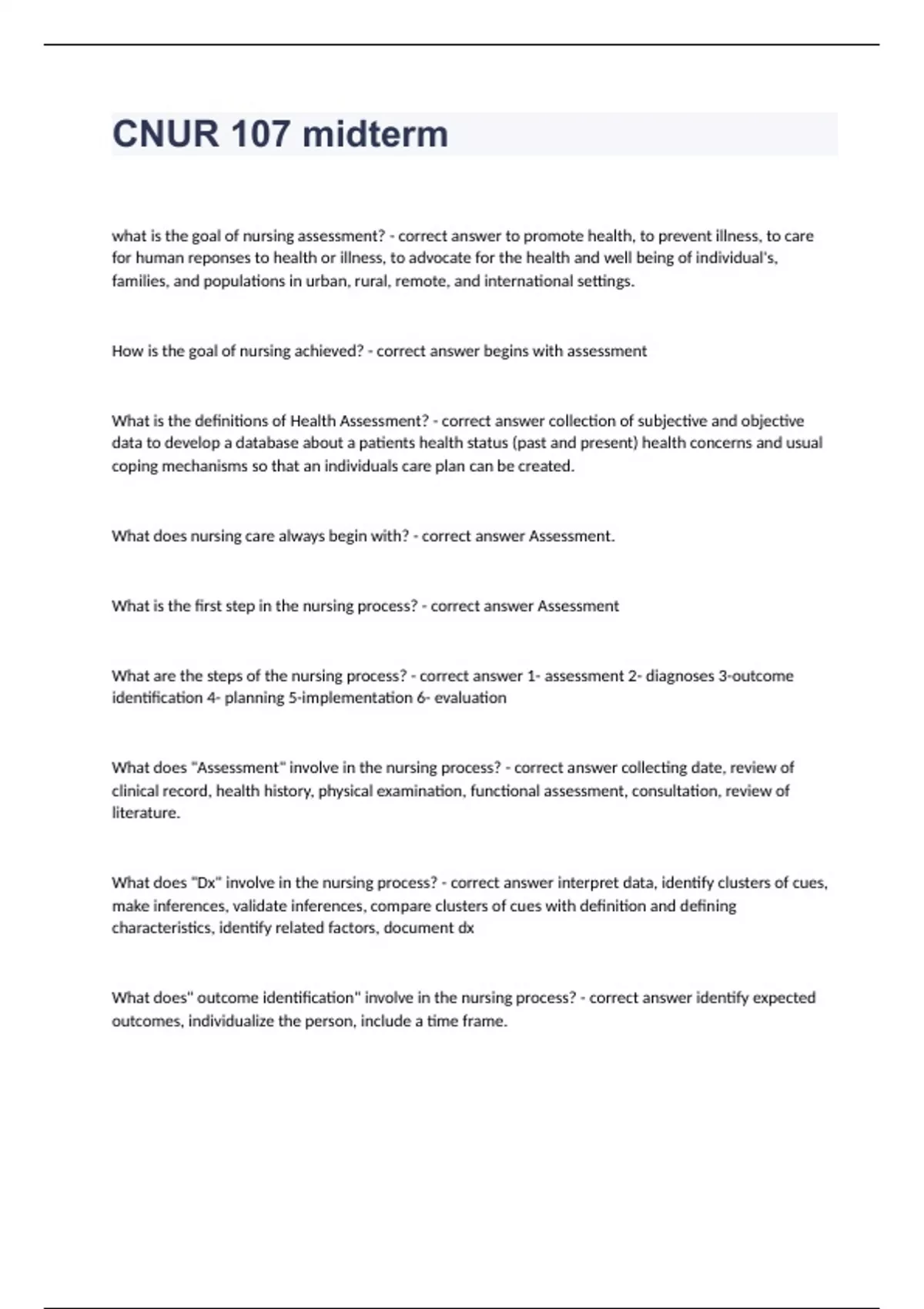 CNUR 107 midtermwhat is the goal of nursing assessment? - correct answer to promote health, to prevent illness, to care for human reponses to health or illness, to advocate for the health and well being of individual's, families, and populations in urban, rural, remote, and international settings. How is the goal of nursing achieved? - correct answer begins with assessment What is the definitions of Health Assessment? - correct answer collection of subjective and objective data to develop a database about a patients health status (past and present) health concerns and usual coping mechanisms so that an individuals care plan can be created. What does nursing care always begin with? - correct answer Assessment. What is the first step in the nursing process? - correct answer Assessment What are the steps of the nursing process? - correct answer 1- assessment 2- diagnoses 3-outcome identification 4- planning 5-implementation 6- evaluation What does "Assessment" involve in the nursing process? - correct answer collecting date, review of clinical record, health history, physical examination, functional assessment, consultation, review of literature. What does "Dx" involve in the nursing process? - correct answer interpret data, identify clusters of cues, make inferences, validate inferences, compare clusters of cues with definition and defining characteristics, identify related factors, document dx What does" outcome identification" involve in the nursing process? - correct answer identify expected outcomes, individualize the person, include a time frame. What does"planning" involve in the nursing process? - correct answer establish priorities, develop outcomes, set time frame for outcomes,document plan of care what does "implementation" involve in the nursing process? - correct answer review planned interventions,schedule and coordinate the persons total health care, corroborate w other team members, document the care provided, counsel the per and significant others, supervise implementation of the care plan by delegating appropriate responsibilities. What does "Evaluation" involve in the nursing process? - correct answer summarize the results of evaluation, identify reasons for the persons failure, if indicated, to achieve expected outcomes stated in the plan of care, document the evaluation of the persons achievement of outcomes and the modifications, if any in the plan of care. definition of wellness - correct answer Definition of Wellness. Wellness is an active process of becoming aware of and making choices toward a healthy and fulfilling life. "...a state of complete physical, mental, and social well-being, and not merely the absence of disease or infirmity." - The World Health Organization. definition of health - correct answer "a complete state of physical, mental and social well-being, and not merely the absence of disease or infirmity." definition of health promotion - correct answer Health promotion is the process of enabling people to increase control over, and to improve, their health. It moves beyond a focus on individual behaviour towards a wide range of social and environmental interventions. What is health history? - correct answer interview what is physical examination? - correct answer observation/measurements what are the components of assessment? - correct answer health history and physical examination. what are the four types of assessment? - correct answer 1-complete ( total health) 2-episodic or problem-centered( one symptom of one immediate problem.) 3-Emergency ( someone is having a baby right away) 4-follow up assessment. example of complete assessment? - correct answer head to toe assessment, first time with patient. what is the purpose of a complete assessment? - correct answer gives us a baseline to start and then to start to see and trend foundations what time would a complete assessment be performed? - correct answer during admission. example of episodic/problem based assessment? - correct answer certain problem/symptom found ex: abdominal pain what is purpose of episodic/problem based assessment? - correct answer to identify and deal w that specific problem what time would a episodic/problem based assessment be performed? - correct answer we would deal with the problem right away then come up with a plan afterwords example of emergency assessment? - correct answer baby being born asap, seizure, heart attack what is the purpose of an emergency assessment? - correct answer to focus on the critical issue ( usually is something life threatening ) What is an example of a follow up assessment? - correct answer next time working on shift/seeing patient what is the purpose of follow up assessment? - correct answer comparing their health status to where they were before. what time would a follow up assessment be performed? - correct answer time ranges.