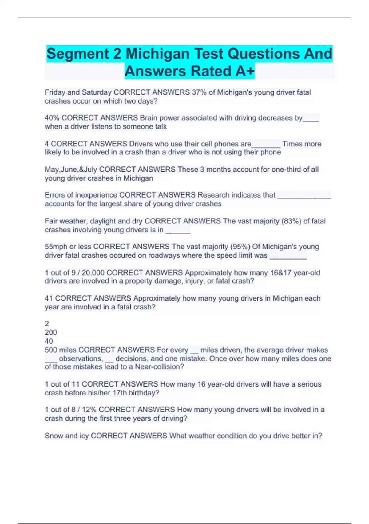 Segment 2 Michigan Test Questions And Answers Rated A+
