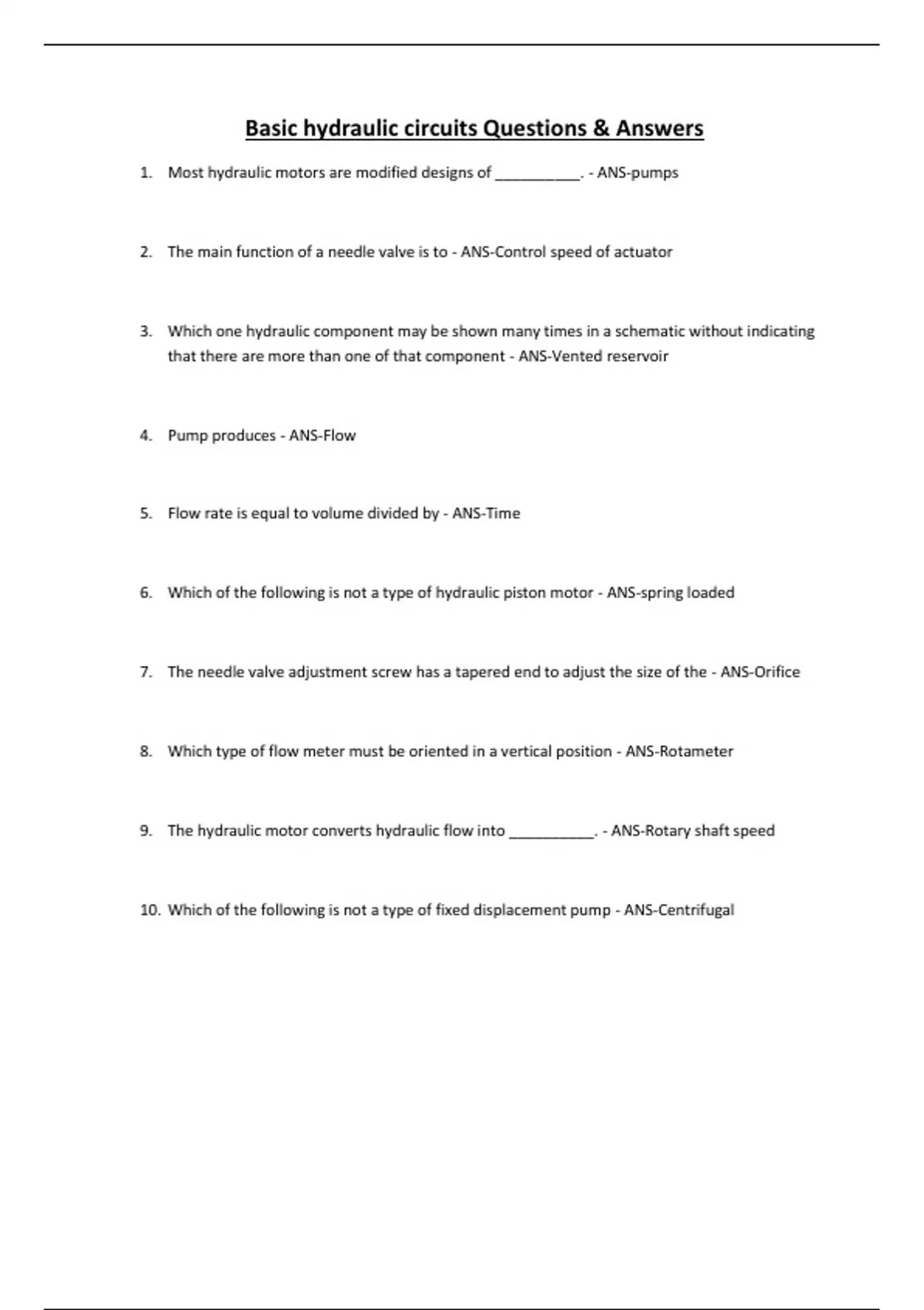 Basic hydraulic circuits Questions & Answers 1. Most hydraulic motors are modified designs of __________. - ANS-pumps 2. The main function of a needle valve is to - ANS-Control speed of actuator 3. Which one hydraulic component may be shown many times in a schematic without indicating that there are more than one of that component - ANS-Vented reservoir 4. Pump produces - ANS-Flow 5. Flow rate is equal to volume divided by - ANS-Time 6. Which of the following is not a type of hydraulic piston motor - Continues...