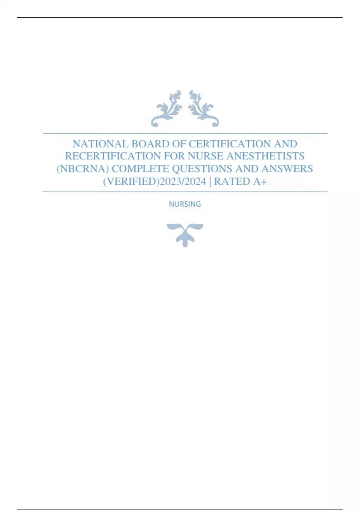 NATIONAL BOARD OF CERTIFICATION AND RECERTIFICATION FOR NURSE ANESTHETISTS (NBCRNA) COMPLETE QUESTIONS AND ANSWERS (VERIFIED)2023/2024 | RATED A+