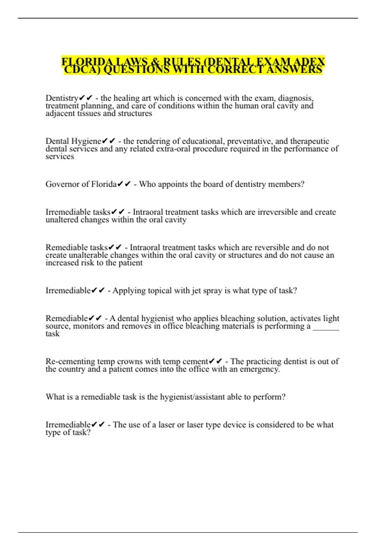 FLORIDA LAWS & RULES (DENTAL EXAM ADEX CDCA) QUESTIONS WITH CORRECT ANSWERS