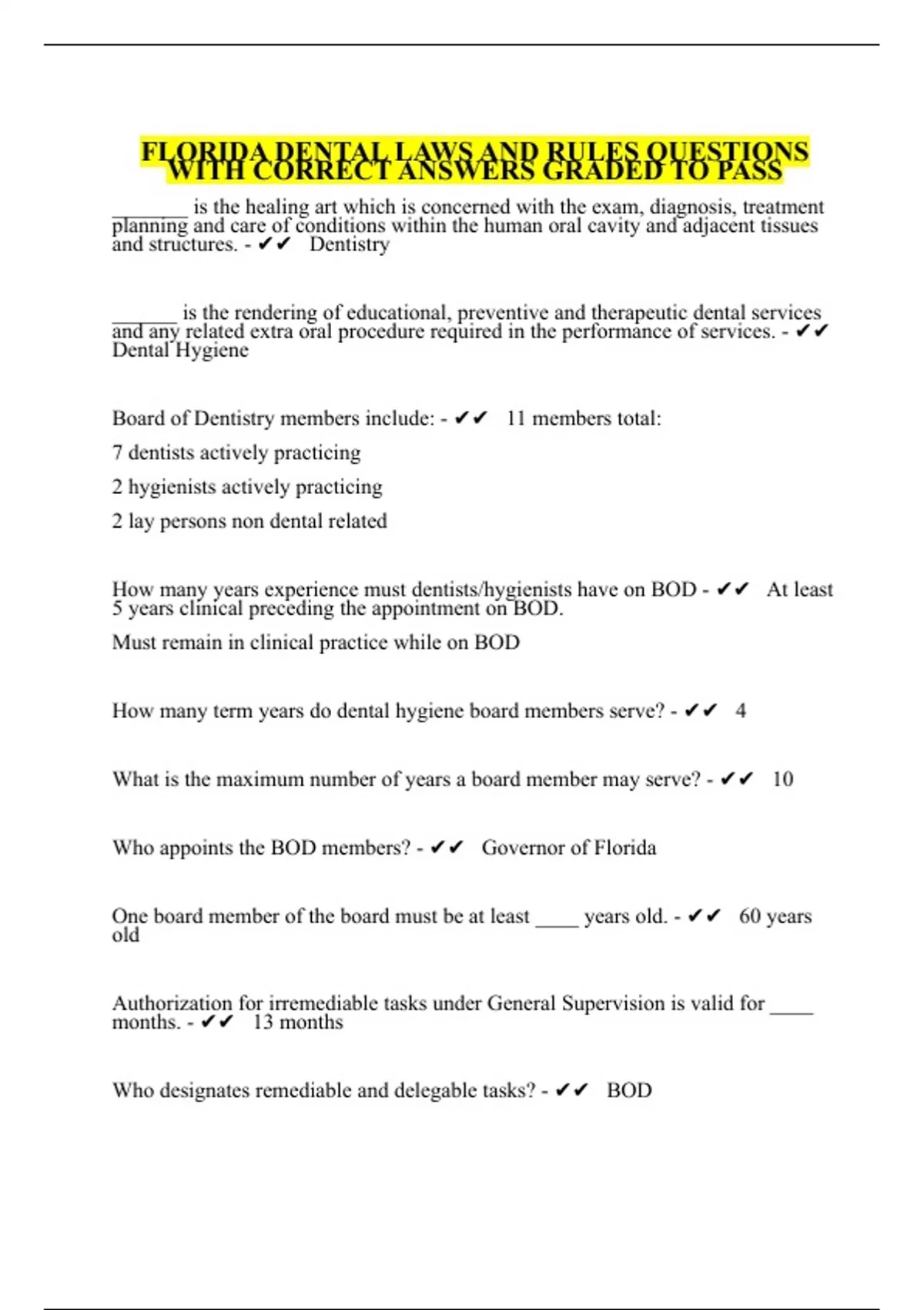 FLORIDA DENTAL LAWS AND RULES QUESTIONS WITH CORRECT ANSWERS GRADED TO PASS
