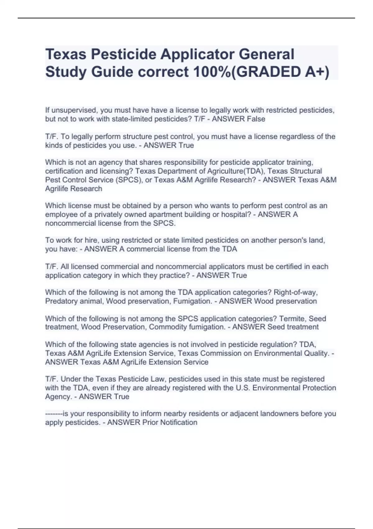 Texas Pesticide Applicator General Study Guide correct 100%(GRADED A+)