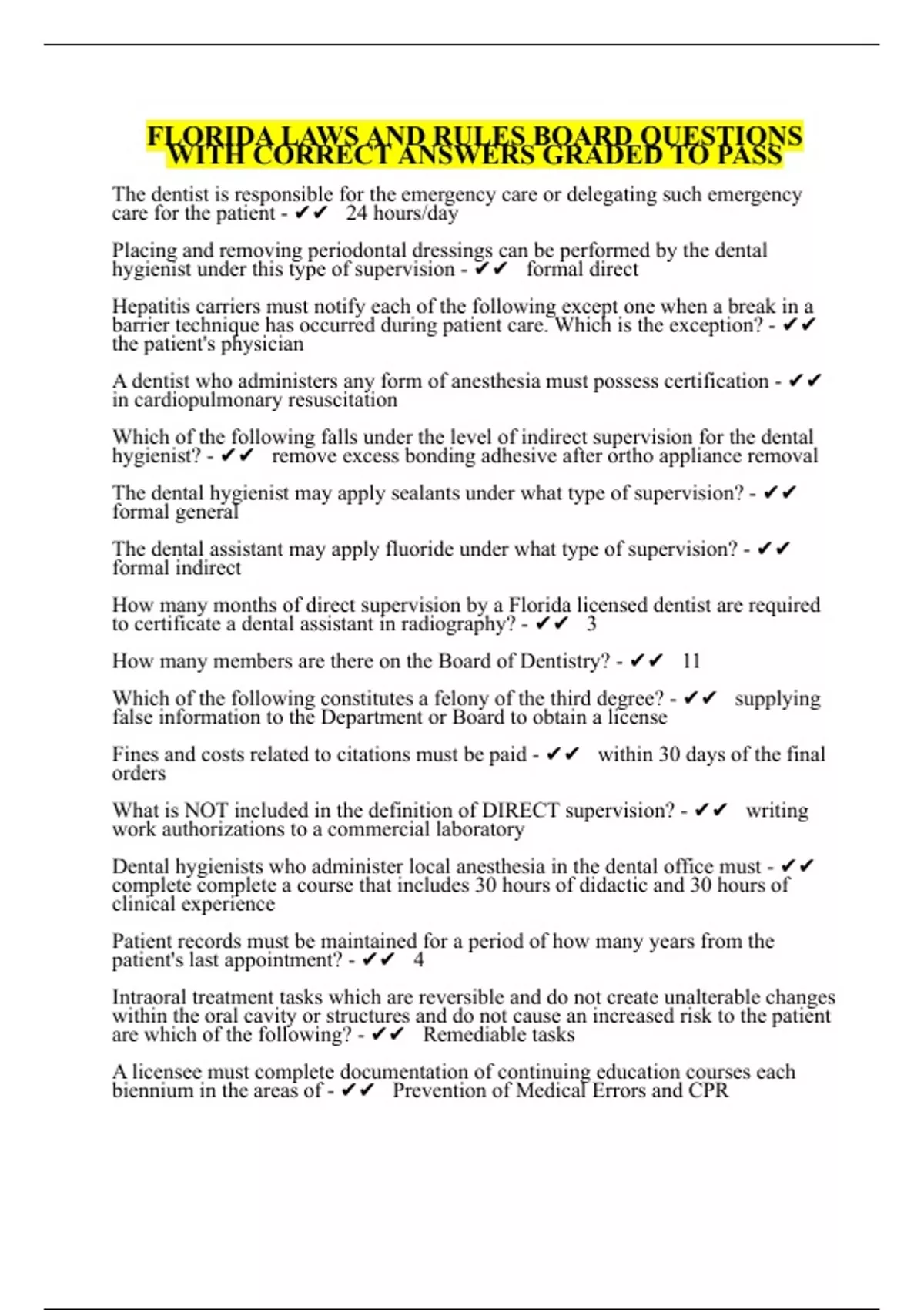 The dentist is responsible for the emergency care or delegating such emergency care for the patient - 24 hours/day Placing and removing periodontal dressings can be performed by the dental hygienist under this type of supervision - formal direct Hepatitis carriers must notify each of the following except one when a break in a barrier technique has occurred during patient care. Which is the exception? - the patient's physician A dentist who administers any form of anesthesia must possess certification - in cardiopulmonary resuscitation Which of the following falls under the level of indirect supervision for the dental hygienist? - remove excess bonding adhesive after ortho appliance removal The dental hygienist may apply sealants under what type of supervision? - formal general The dental assistant may apply fluoride under what type of supervision? - formal indirect How many months of direct supervision by a Florida licensed dentist are required to certificate a dental assistant in radiography? - 3 How many members are there on the Board of Dentistry? - 11 Which of the following constitutes a felony of the third degree? - supplying false information to the Department or Board to obtain a license Fines and costs related to citations must be paid - within 30 days of the final orders What is NOT included in the definition of DIRECT supervision? - writing work authorizations to a commercial laboratory Dental hygienists who administer local anesthesia in the dental office must - complete complete a course that includes 30 hours of didactic and 30 hours of clinical experience Patient records must be maintained for a period of how many years from the patient's last appointment? - 4 Intraoral treatment tasks which are reversible and do not create unalterable changes within the oral cavity or structures and do not cause an increased risk to the patient are which of the following? - Remediable tasks A licensee must complete documentation of continuing education courses each biennium in the areas of - Prevention of Medical Errors and CPR The dentist of record shall be identified in the record of the patient. Who must place their name or initials in the record when they render treatment to the patient? - the dentist, hygienist, and assistant You have a current and active Florida license. You are being investigated for alleged forgery of pharmacy prescriptions. You are required to provide - a handwriting sample if requested An acceptable prescription written by a dentist for the services of a dental hygienist must include the patient's - name and address Dental assistants may never - do prophylaxis Your hygiene license has been inactive for 2 years. To reactivate your license you must pay a reactivation fee and provide proof of how many hours of continuing education? - 24 Appropriate subject matter for continuing education for dental hygienists would include which of the following? - patient stress management The dentist has just hired a new assistant. She has not had any formal training. He would like her to be trained immediately to be a radiographer. You are permitted to provide her with on-the-job training as part of her certification provided - you are not permitted to provide the training You failed to renew your license and have been practicing for a period of 2 months in violation of Chapter 466. As a result, you are subject to pay a - $250 fine A patient of record returns to the office after being away for 25 months. The doctor is in the office but is too busy to see the patient. The patient complains that a temporary crown made during the last visit is loose and that she would like it recemented. She states she has not returned because she is waiting to have money to pay for the crown. As the hygienist in the office, you should - reschedule the patient for the doctor What is the minimum number of continuing education hours that at dental hygienist must complete biennially for re-licensure? - 24 You have violated Rule 64B5 by renewing your license without the required continuing education credits. The penalty for the hygienist includes - administrative fine of $25 per hour for each hour not completed and completion of uncompleted requirements Examiners are required to attend a standardization exercise - conducted by the Department prior to each examination Which of the following would be legally acceptable for a dentist to write a prescription? - Writing within the scope of dentistry As a practicing dental hygienist you are permitted to perform the following task under general supervision: - place periodontal dressings A dental hygienist may root plane under what level of supervision? - General A Florida CRDH must notify the Board in writing by registered mail postmarked withing how many hours of any adverse occurrence related to, or the result of administration of, local anesthesia? - 48 hours You are performing a regular 3 month recare prophylaxis with a prescription for services at the patient's house. The patient's daughter is visiting from out of state and asks for a prophylaxis as well. After you have obtained permission from the dentist over the telephone, you perform a prophylaxis on the patient's daughter. You do not charge a fee for the daughter's prophylaxis. Has there been a violation of Florida law? - Both the dentist and hygienist are in violation of Chapter 466. Who owns the patient record or chart? - The dentist If you move, within how many days must you notify the Board? - 10 days If a dentist advertises a price for a service, but doesn't put an ending date on the advertisement, how long must the price stay in effect after the last day of the advertisement? - 90 days All of the following except one are appropriate areas of study for continuing education. Which is the exception? - dental office design Direct supervision means: - dentist diagnoses, authorizes the procedure, remains on the premises, and approves the work Persons exempt from the operation of Chapter 466 include: 