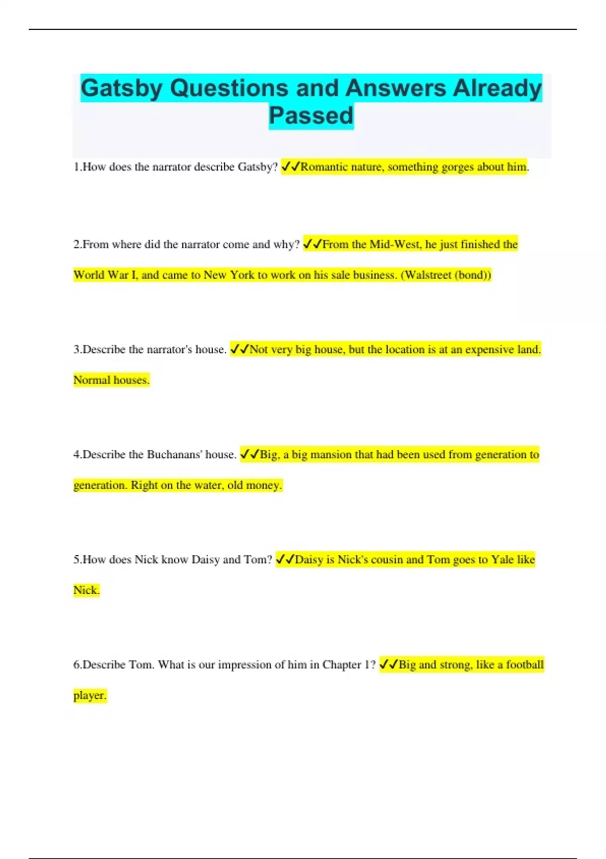 1.How does the narrator describe Gatsby? Romantic nature, something gorges about him. 2.From where did the narrator come and why? From the Mid-West, he just finished the World War I, and came to New York to work on his sale business. (Walstreet (bond)) 3.Describe the narrator's house. Not very big house, but the location is at an expensive land. Normal houses. 4.Describe the Buchanans' house. Big, a big mansion that had been used from generation to generation. Right on the water, old money.