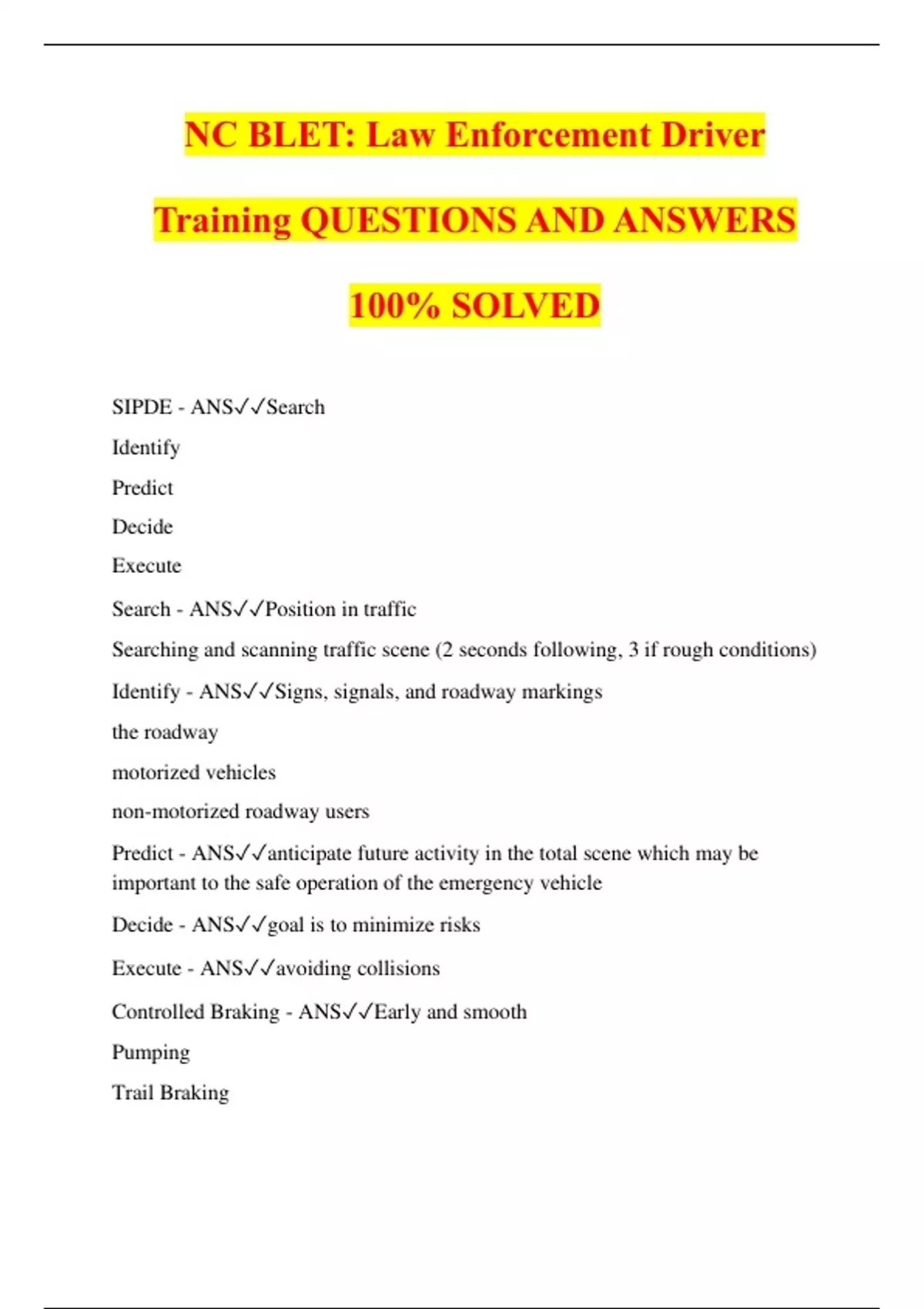 NC BLET: Law Enforcement Driver Training QUESTIONS AND ANSWERS 100% SOLVED SIPDE - ANSSearch Identify Predict Decide Execute Search - ANSPosition in traffic Searching and scanning traffic scene (2 seconds following, 3 if rough conditions) Identify - ANSSigns, signals, and roadway markings the roadway motorized vehicles non-motorized roadway users Predict - ANSanticipate future activity in the total scene which may be important to the safe operation of the emergency vehicle Decide - ANSgoal is to minimize risks Execute - ANSavoiding collisions Controlled Braking - ANSEarly and sm