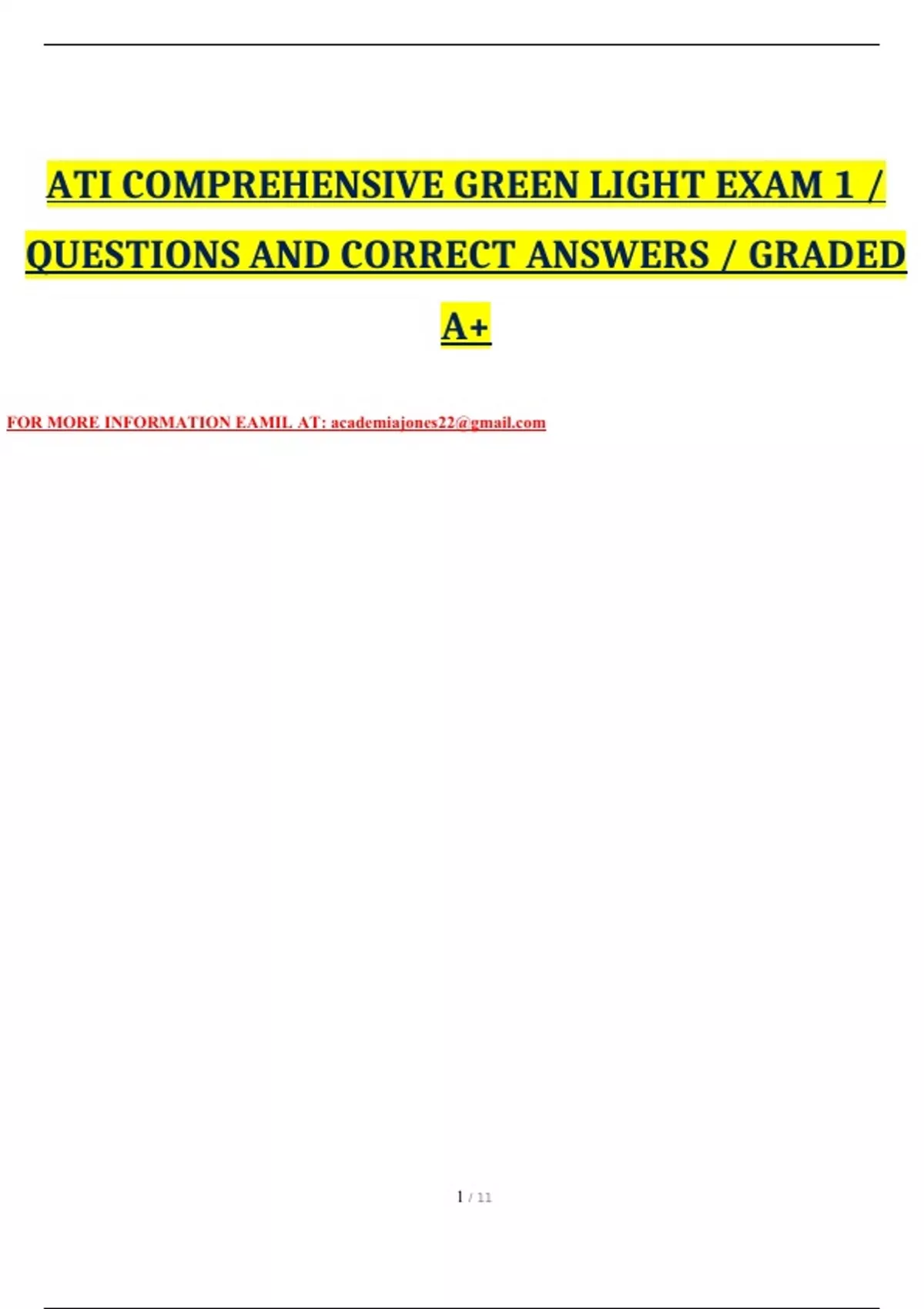 ATI COMPREHENSIVE GREEN LIGHT EXAM 1 / QUESTIONS AND CORRECT ANSWERS / GRADED A+