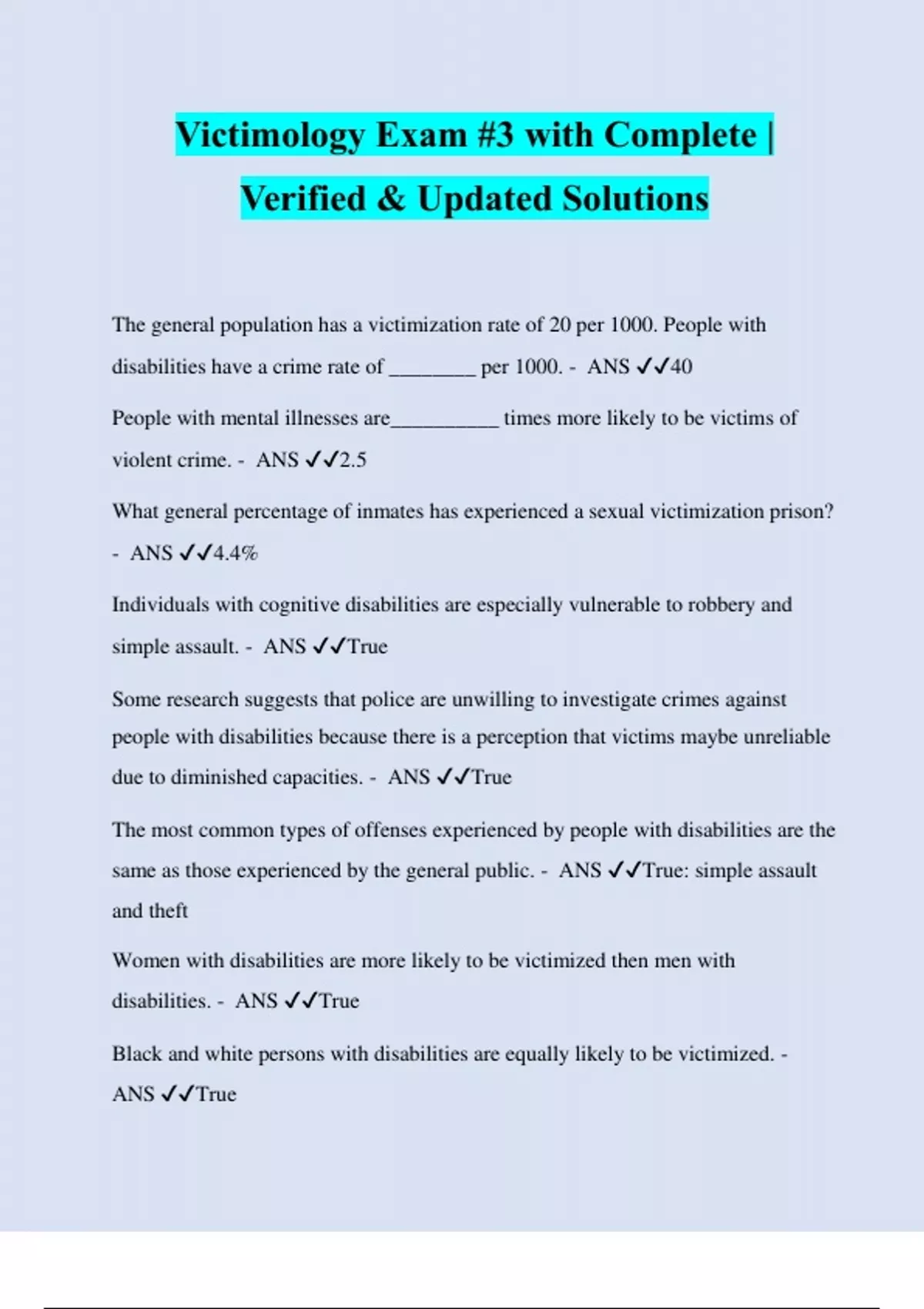 Victimology Exam #3 with Complete | Verified & Updated Solutions The general population has a victimization rate of 20 per 1000. People with disabilities have a crime rate of ________ per 1000. - ANS ️️ 40 People with mental illnesses are__________ times more likely to be victims of violent crime. - ANS ️️ 2.5 What general percentage of inmates has experienced a sexual victimization prison? - ANS ️️ 4.4% Individuals with cognitive disabilities are especially vulnerable to robbery and simple assault. - ANS ️️ True Some research suggests that police are unwilling to investigate crimes against people with disabilities because there is a perception that victims maybe unreliable due to diminished capacities. - ANS ️️ True The most common types of offenses experienced by people with disabilities are the same as those experienced by the general public. - ANS ️️ True: simple assault and theft Women with disabilities are more likely to be victimized then men with disabilities. - ANS ️️ True Black and white persons with disabilities are equally likely to be victimized. - ANS ️️ True