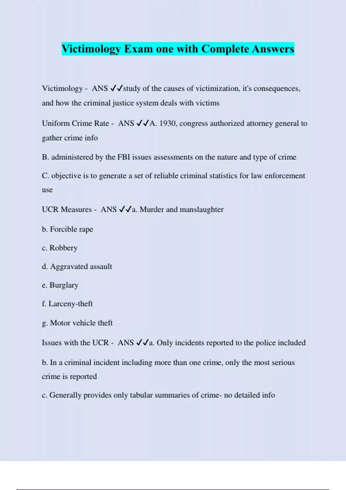Victimology Exam one with Complete Answers Victimology - ANS ️️ study of the causes of victimization, it's consequences, and how the criminal justice system deals with victims Uniform Crime Rate - ANS ️️ A. 1930, congress authorized attorney general to gather crime info B. administered by the FBI issues assessments on the nature and type of crime C. objective is to generate a set of reliable criminal statistics for law enforcement use UCR Measures - ANS ️️ a. Murder and manslaughter b. Forcible rape c. Robbery d. Aggravated assault e. Burglary f. Larceny-theft g. Motor vehicle theft Issues with the UCR - ANS ️️ a. Only incidents reported to the police included b. In a criminal incident including more than one crime, only the most serious crime is reported c. Generally provides only tabular summaries of crime- no detailed info