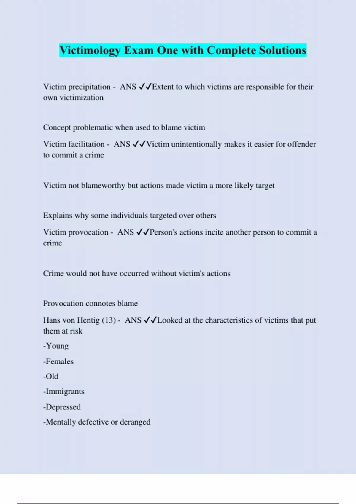Victimology Exam One with Complete Solutions Victim precipitation - ANS ️️ Extent to which victims are responsible for their own victimization Concept problematic when used to blame victim Victim facilitation - ANS ️️ Victim unintentionally makes it easier for offender to commit a crime Victim not blameworthy but actions made victim a more likely target Explains why some individuals targeted over others Victim provocation - ANS ️️ Person's actions incite another person to commit a crime Crime would not have occurred without victim's actions Provocation connotes blame Hans von Hentig (13) - ANS ️️ Looked at the characteristics of victims that put them at risk -Young -Females -Old -Immigrants -Depressed -Mentally defective or deranged