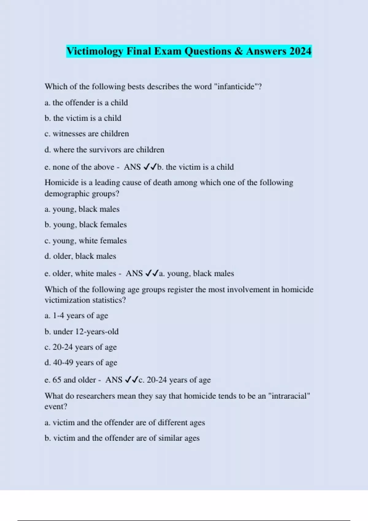 Victimology Final Exam Questions & Answers 2024 Which of the following bests describes the word "infanticide"? a. the offender is a child b. the victim is a child c. witnesses are children d. where the survivors are children e. none of the above - ANS ️️ b. the victim is a child Homicide is a leading cause of death among which one of the following demographic groups? a. young, black males b. young, black females c. young, white females d. older, black males e. older, white males - ANS ️️ a. young, black males Which of the following age groups register the most involvement in homicide victimization statistics? a. 1-4 years of age b. under 12-years-old c. 20-24 years of age d. 40-49 years of age e. 65 and older - ANS ️️ c. 20-24 years of age What do researchers mean they say that homicide tends to be an "intraracial" event? a. victim and the offender are of different ages b. victim and the offender are of similar ages c. victim and the offender are members of different races d. victim and the offender are members of the same race e. victim and the offender come from the same urban area - ANS ️️ d. victim and the offender are members of the same race Which of the following best describes a "primary murder"? a. a premeditated homicide b. a death involving gross negligence c. a homicide that a suspect commits during the course of a robbery d. a death resulting from medical malpractice e. a homicide between intimate partners - ANS ️️ e. a homicide between intimate partner