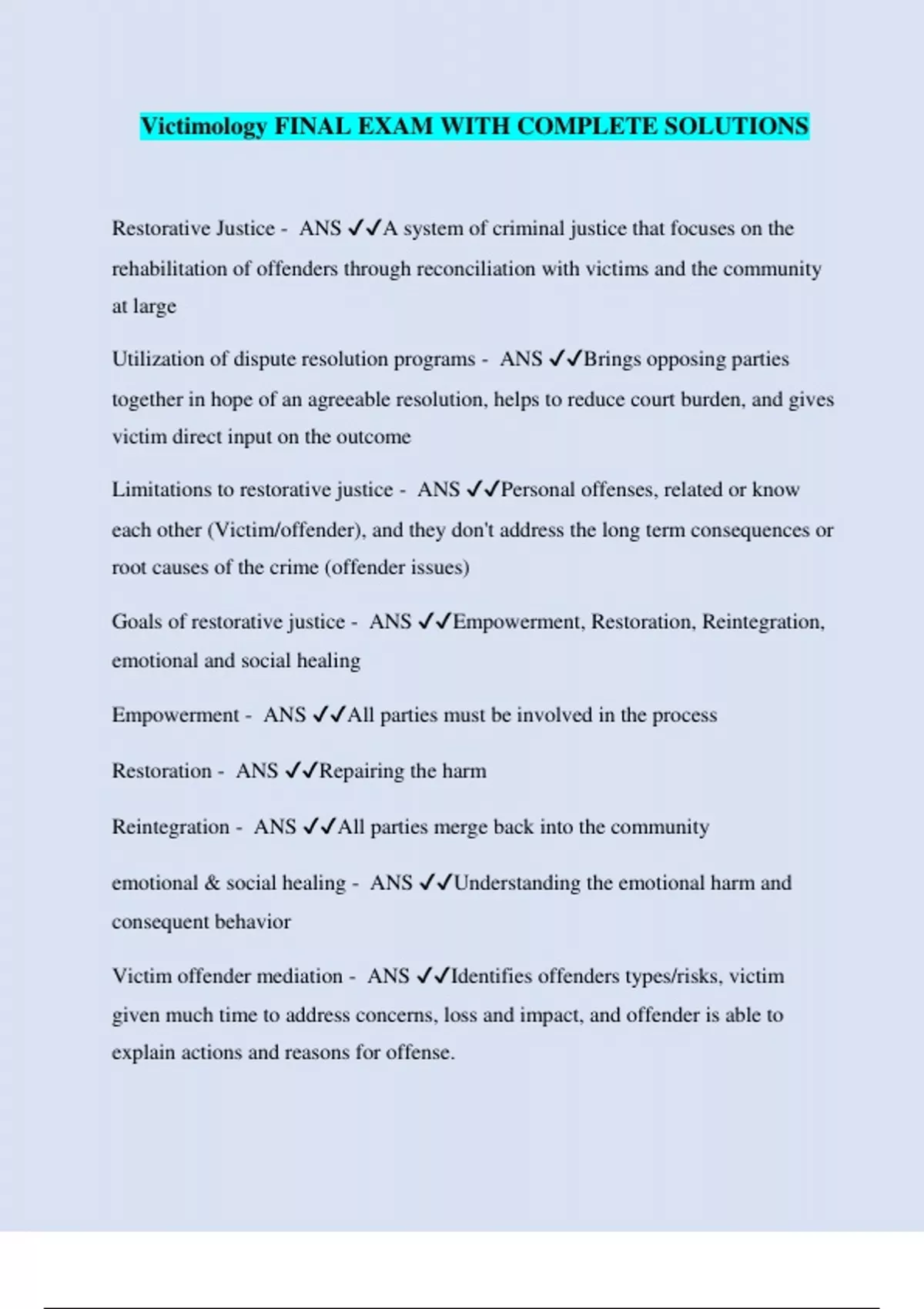 Victimology FINAL EXAM WITH COMPLETE SOLUTIONS Restorative Justice - ANS ️️ A system of criminal justice that focuses on the rehabilitation of offenders through reconciliation with victims and the community at large Utilization of dispute resolution programs - ANS ️️ Brings opposing parties together in hope of an agreeable resolution, helps to reduce court burden, and gives victim direct input on the outcome Limitations to restorative justice - ANS ️️ Personal offenses, related or know each other (Victim/offender), and they don't address the long term consequences or root causes of the crime (offender issues) Goals of restorative justice - ANS ️️ Empowerment, Restoration, Reintegration, emotional and social healing Empowerment - ANS ️️ All parties must be involved in the process Restoration - ANS ️️ Repairing the harm Reintegration - ANS ️️ All parties merge back into the community emotional & social healing - ANS ️️ Understanding the emotional harm and consequent behavior Victim offender mediation - ANS ️️ Identifies offenders types/risks, victim given much time to address concerns, loss and impact, and offender is able to explain actions and reasons for offense.