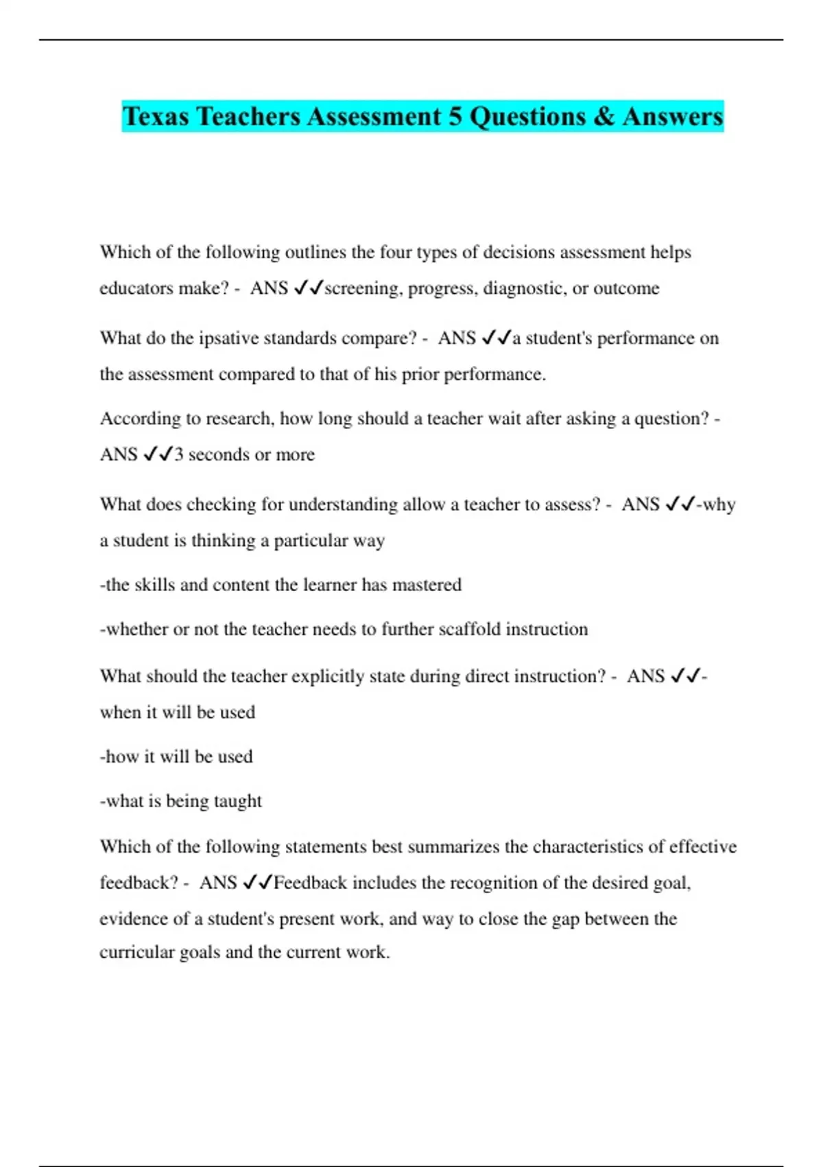 Texas Teachers Assessment 5 Questions & Answers Which of the following outlines the four types of decisions assessment helps educators make? - ANS ️️ screening, progress, diagnostic, or outcome What do the ipsative standards compare? - ANS ️️ a student's performance on the assessment compared to that of his prior performance. According to research, how long should a teacher wait after asking a question? - ANS ️️ 3 seconds or more What does checking for understanding allow a teacher to assess? - ANS ️️ -why a student is thinking a particular way -the skills and content the learner has mastered -whether or not the teacher needs to further scaffold instruction What should the teacher explicitly state during direct instruction? - ANS ️️ - when it will be used -how it will be used -what is being taught Which of the following statements best summarizes the characteristics of effective feedback? - ANS ️️ Feedback includes the recognition of the desired goal, evidence of a student's present work, and way to close the gap between the curricular goals and the current work. What does modeling allow students to better understand? - ANS ️️ -how to develop inner dialogue -how to develop a skill or problem solving strategy According to Fisher and Frey, what type of "robust" question is provided below?If you could give Romeo and Juliet advice, what would you tell them? - ANS ️️ inventive question Which of the following explains why a teacher might ask an elicitation question as opposed to a heuristic question? - ANS ️️ when the teacher wants to better understand a student's prior knowledge According to Fisher and Frey, what type of "robust" question is provided below?Can you show me where you found that information? - ANS ️️ clarification question Joey, a tenth grade student, is struggling to pass his English I End of Course exam. Which of the following should Joey's teacher use to determine current level of performance and growth? - ANS ️️ Ipsative standards Rather than simply correcting a student that responds incorrectly to a question, which of the following strategy would be best for a teacher to use? - ANS ️️ cuing Formative assessment plays a critical role in student learning and achievement. When planning lessons, what should the teacher consider? - ANS ️️ type of questions asked, wait time provided, number of opportunities to respond to higher order questions, and quality feedb
